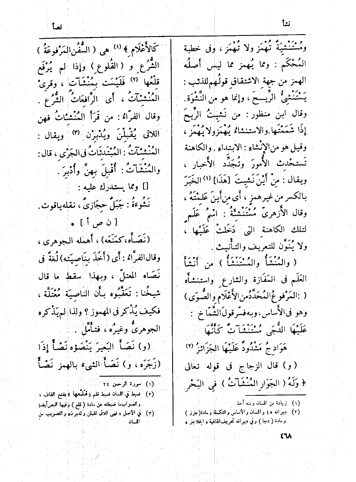 (و) قَالَ الزّجاج فِي قَوْله تَعَالَى {وَلَهُ الْجَوَارِ} الْمُنشَآتُ فِى الْبَحْرِ كَالاْعْلَامِ} (الرحمان: 24) هِيَ (السُّفُن المَرْفوعَةُ) الشُّرُعِ و (القُلوعِ) وإِذا لم يُرْفَع قِلْعُها فَلَيْسَت {بِمُنْشَآتٍ، وقرِىء} المُنْشِئآتُ، أَي الرَّافِعَاتُ الشُّرُع. وَقَالَ الفرّاءُ: من قَرَأَ {المُنْشِئاتُ فهن اللَّاتِي يُقْبِلْنَ ويُدْبِرْن وَيُقَال: المُنْشِئآتُ: المُبْتَدِئَاتُ فِي الجَرْيِ، قَالَ: والمُنْشَآتُ: أُقْبِلَ بِهنَّ وأُدْبِرَ.