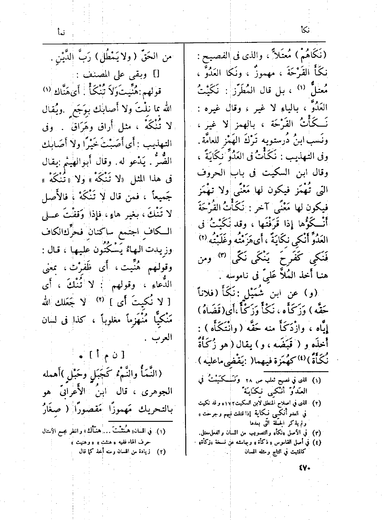 (نَكَاهُمْ) مُعتَلاً، وَالَّذِي فِي (الفصيح) {نكَأَ القَرْحَةَ، مهموزٌ، ونَكا العَدُوَّ، مُعتلٌّ، بل قَالَ المُطَرّز: نَكَيْتُ العَدُوَّ، بالياءِ لَا غير، وَقَالَ غَيره: نَكَأْتُ القَرْحَة، بالهز لَا غير، ونَسب ابنُ دُرستويه تَرْكَ الهَمحزِ للعامَّة. وَفِي (التَّهْذِيب) : نَكَأْتُ فِي العَدُوِّ نِكَايَةً، وَقَالَ ابْن السّكيت فِي بَاب الْحُرُوف الَّتِي تُهْمَز فَيكون لَهَا مَعْنَى وَلَا تهْمَز فَيكون لَهَا مَعْنَى آخر: نَكَأْتُ القُرْحَةَ} أَنْكَؤُها إِذا قَرَفْتَها، وَقد نَكَيْتُ فِي العَدُوِّ أَنْكِي نِكَايَةً، أَي هَزَمْتُه وغَلَبْتُه فَنَكِي كَفَرِحَ يَنكَي نَكي وَمن هُنَا أَذخ المُلاَّ عَلِيّ فِي ناموسه.