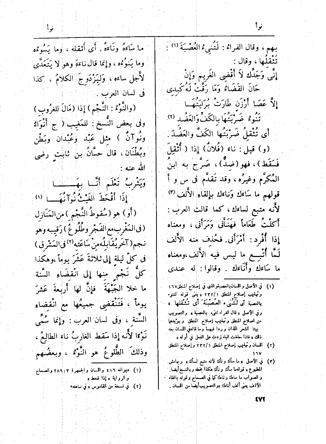 (} والنَّوْءُ: النَّجْم) إِذا (مَالَ للغرُوبِ) وَفِي بعض النُّسخ: للمَغِيب (ج {أَنْوَاءٌ} ونُوآنٌ) مِثل عَبْد وعُبْدان وبَطْن وبُطْنَان، قَالَ حسَّانُ بن ثابتٍ رَضِي الله عَنهُ: