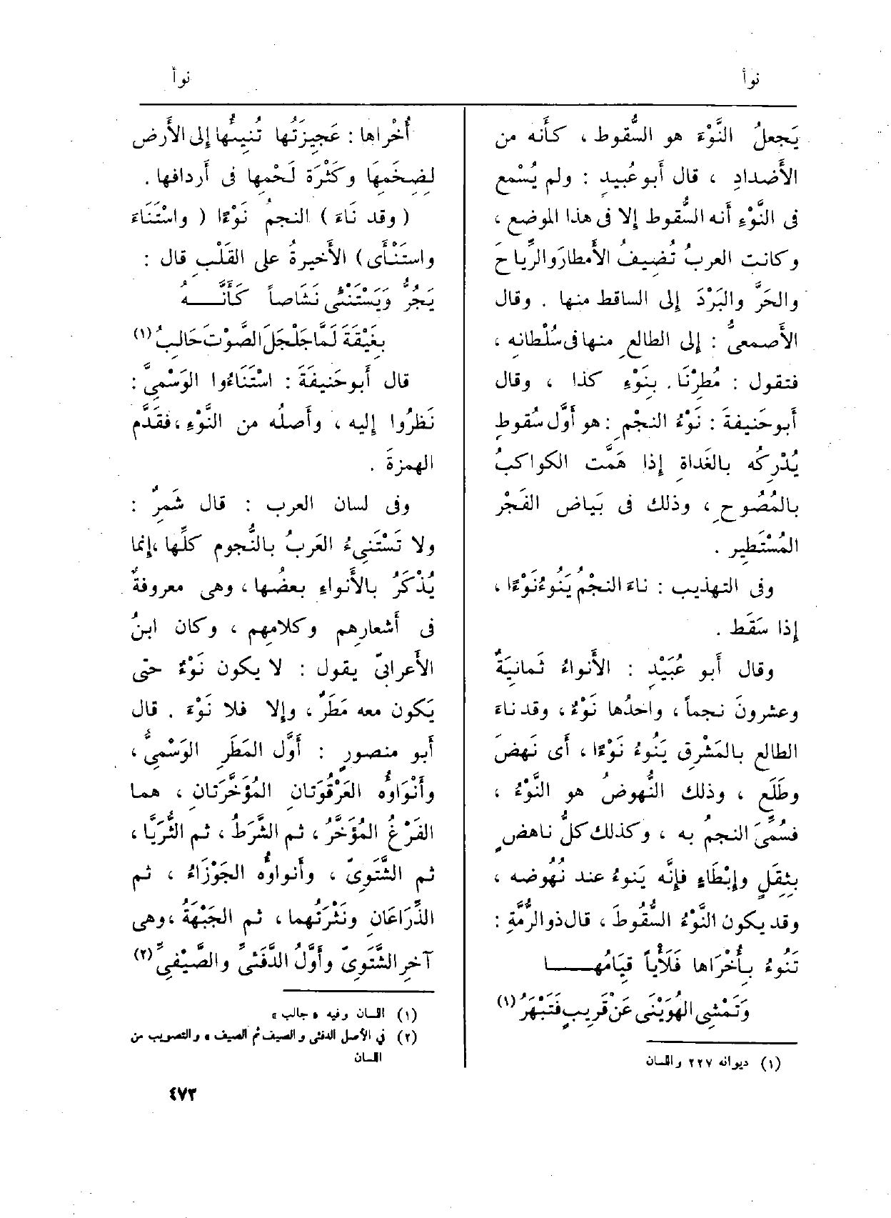 وَقَالَ أَبو عُبَيْدٍ:} الأَنواءُ ثَمانِيَةٌ وعشرونَ نجماً، واحدُها نَوْءٌ، وَقد ناءَ الطالع بالمَشْرِق يَنُوءُ نَوْءًا، أَي نَهضَ وطَلَع، وَذَلِكَ النُّهوضُ هُوَ النَّوْءُ، فسُمِّيَ النجمُ بِهِ، وَكَذَلِكَ كلُّ ناهضٍ بِثِقَلٍ وإِبْطَاءٍ فإِنَّه يَنوءُ عِنْد نُهُوضه، وَقد يكون النَّوْءُ السُّقُوطَ، قَالَ ذُو الرُّمَّةِ: