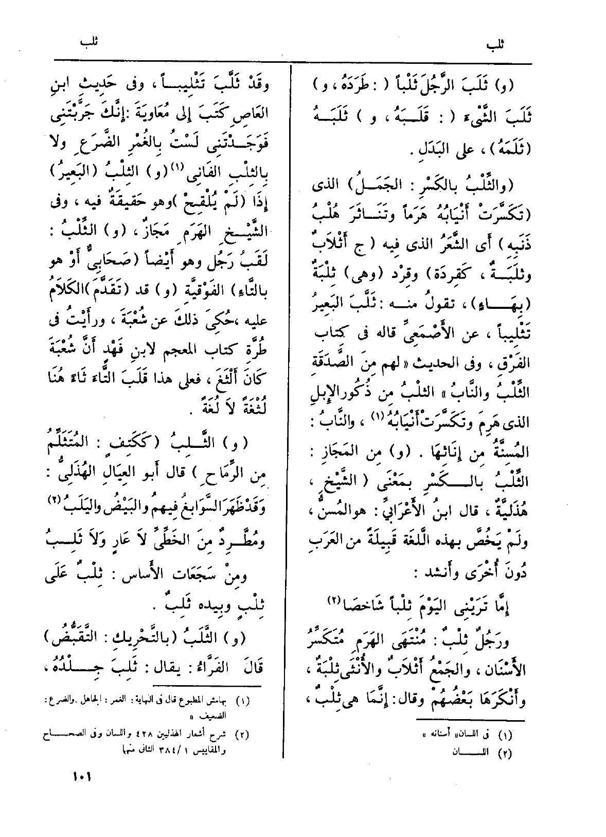 (و) الثَّلِبُ (كَكَتِفٍ: المُتَثَلِّمُ مِن الرِّمَاحِ) قَالَ أَبو العِيَال الهُذَلِيُّ: وَقَدْ ظَهَرَ السَّوَابغُ فِيهمُ والبَيْضُ واليَلَبُ ومُطَّرِدٌ مِنَ الخَطِّيِّ لاَ عَارٍ وَلاَ ثَلِبُ.