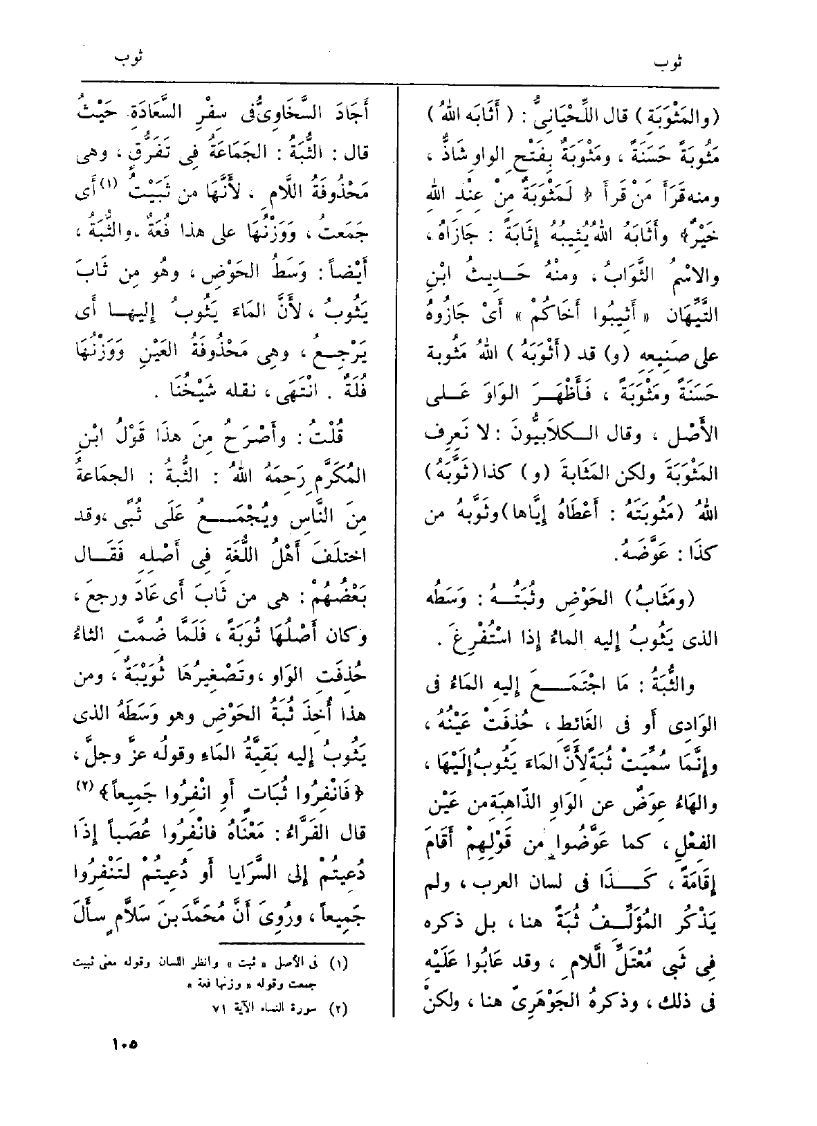 قُلْتُ: وأَصْرَحُ مِنَ هذَا قَوْلُ ابْنِ المُكَرَّمِ رَحِمَهُ اللَّهُ: الثُّبةُ: الجمَاعةُ مِنَ النَّاس ويُجْمَعُ عَلَى} ثُبًى، وَقد اختلَفَ أَهْلُ اللُّغَةِ فِي أَصْلِهِ فَقَال بَعْضُهُمْ: هِيَ من ثَابَ أَي عَادَ ورجعَ، وَكَانَ أَصْلِهَا ثُوَبَةً، فَلَمَّا ضُمَّت الثاءُ حُذِفَتِ الوَاو، وتَصْغِيرُهَا ثُوَيْبَةٌ، وَمن هَذَا أُخِذَ ثُبَةُ الحَوْضِ وَهُوَ وَسَطَهُ الَّذِي يَثُوبُ إِليه بَقِيَّةُ المَاءِ وقولُه عزَّ وجلَّ: {فَانفِرُواْ! ثُبَاتٍ أَوِ انْفِرُواْ جَمِيعاً} (النِّسَاء: 71) قَالَ الفَرَّاءُ: مَعْنَاهُ فانْفِرُوا عُصَباً إِذَا دُعيتُمْ إِلى السَّرَايا أَو دُعِيتُم لتَنْفِرُوا جَمِيعاً، ورُوِيَ أَنَّ مُحَمَّدَ بنَ سَلاَّمٍ سأَلَ