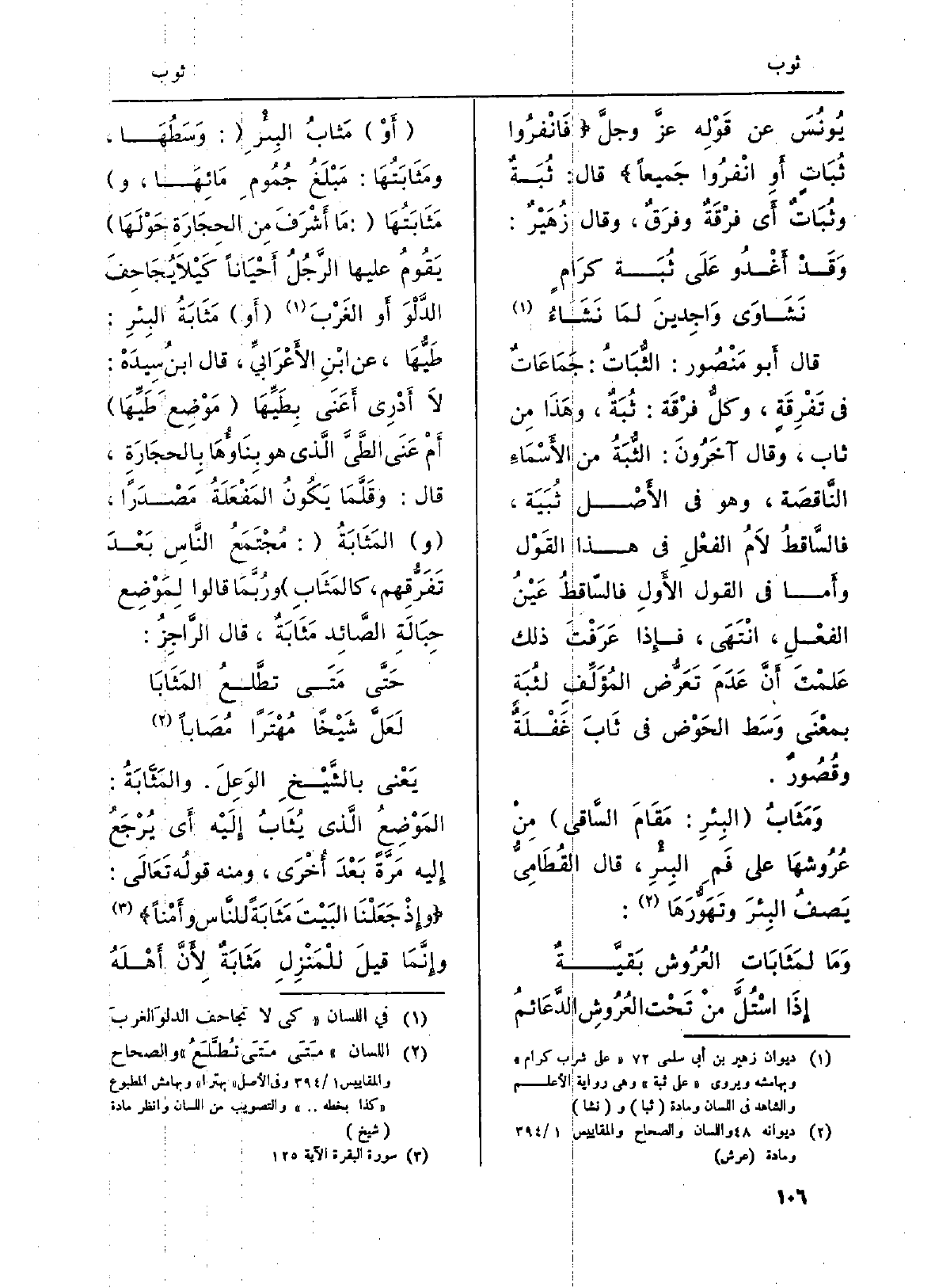 يُونُسَ عَن قَوْلِه عزَّ وجلَّ: {فَانفِرُواْ ثُبَاتٍ أَوِ انْفِرُواْ جَمِيعاً} قَالَ: ثُبَةٌ وثُبَاتٌ أَي فرْقَةٌ وفِرَقٌ، وَقَالَ زُهَيْرٌ: