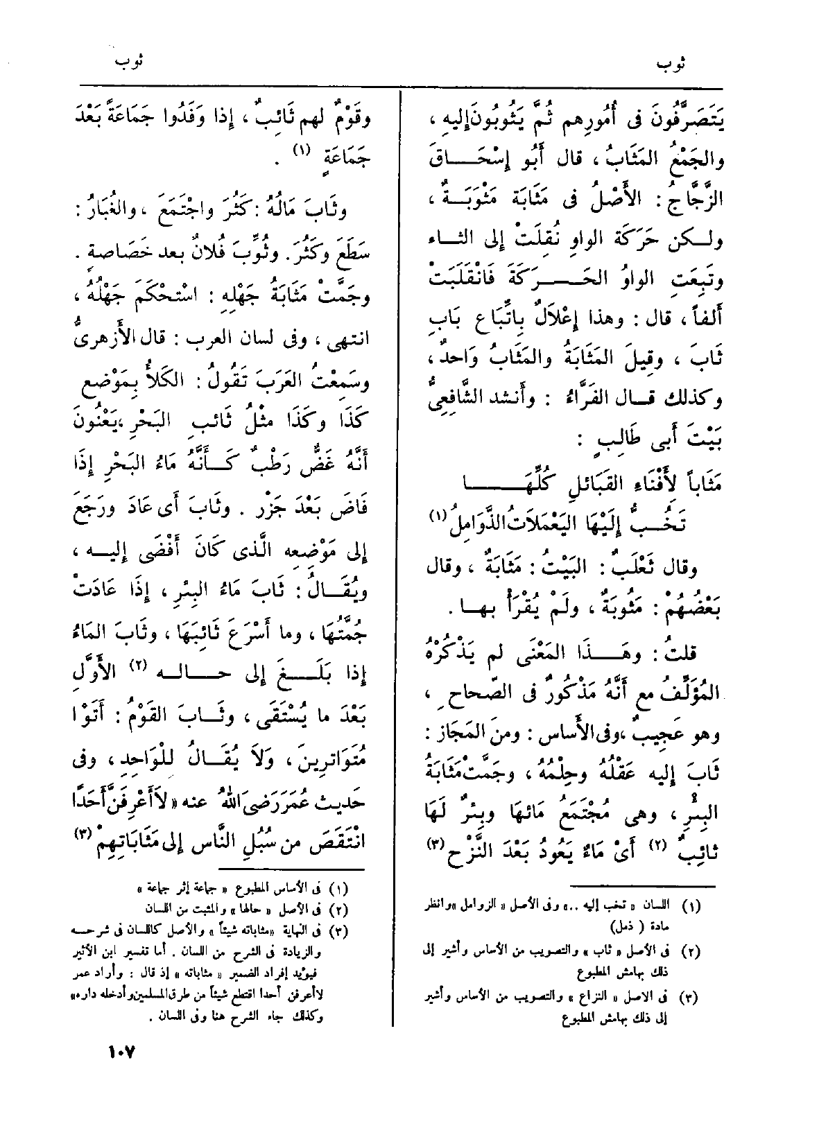 وثَابَ مَالُهُ: كَثُرَ واجْتَمَعَ، والغُبَارِ: سَطَعَ وكَثُرَ. {وثُوِّبَ فُلانٌ بَعْد خَصَاصَةِ. وجَمَّتْ مَثَابَةُ جَهْلِهِ: اسْتَحْكَمَ جَهْلُهُ، انْتهى، وَفِي (لِسَان الْعَرَب) قَالَ الأَزهريُّ وسَمِعْتُ العَرَبَ تَقُولُ: المَلأُ بِمَوْضع كَذَا وكَذَا مِثْلُ ثَائبِ البَحْرِ، يَعْنُونَ أَنَّهُ غَضٌّ رَطْبٌ كَأَنَّهُ مَاءُ البَحْرِ إِذَا فَاضَ بَعْدَ جَزْر. وثَابَ أَي عَادَ ورَجَعَ إِلى مَوْضِعِهِ الَّذِي كَانَ أَفْضَى إِليه، ويُقَالُ: ثَابَ مَاءُ البِئرِ، إِذَا عَادَتْ جُمَّتُهَا، وَمَا أَسْرَع} ثَائِبَهَا، وثَابَ المَاءُ إِذا بَلَغَ إِلى حَاله الأَوَّل بَعْدَ مَا يُسْتَقَى، وثَابَ القَوْمُ: أَتَوْا مُتَوَاترِينَ، وَلاَ يُقَالُ لِلْوَاحِدِ، وَفِي حَديث عُمَرَ رَضِيَ اللَّهُ عنهُ (لاَ أَعْرِفَنَّ أَحَداً انْتَقَصَ من سُبُلِ النَّاسِ إِلى! مَثَابَاتِهِم