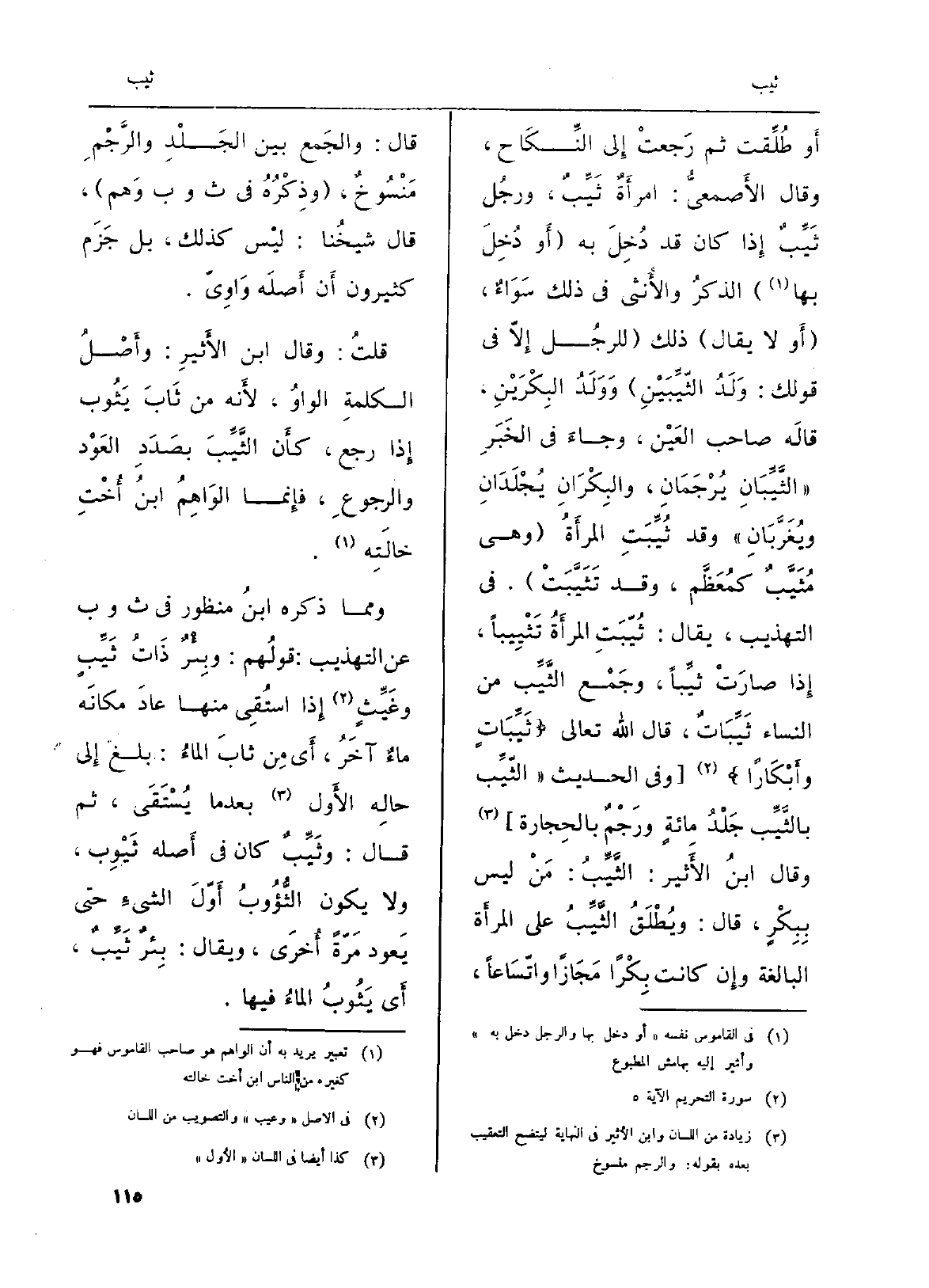 أَو طُلِّقت ثمَّ رَجعتْ إِلى النِّكَاح، وَقَالَ الأَصمعيُّ: امرأَةٌ ثَيِّبٌ، ورجُل ثَيِّبٌ إِذا كَانَ قد دُخِل بِهِ (أَو دُخِلَ بهَا) الذكرُ والأُنثى فِي ذَلِك سَوَاءٌ، (أَو لَا يُقَال) ذَلِك للرجُل إِلاّ فِي قَوْلك: وَلَدٌ {الثّيِّبَيْنِ) وَوَلَدُ البِكْرَيْنِ، قالَه صَاحب العَيْن، وجاءَ فِي الخَبَرِ (} الثَّيِّبَانِ يُرْجَمَانِ، والبِكْرَانِ يُجْلَدَانِ ويُغَرِّبَانِ) وَقد {ثُيِّبَتِ المرأَةُ (وَهِي} مُثَيَّبٌ كمُعَظَّم، وَقد {تَثَيَّبَتْ) . فِي (التَّهْذِيب) ، يُقَال:} ثُيّبَتِ المرأَةُ {تَثْيِيباً، إِذا صارَتْ} ثَيِّباً، وجَمْع {الثَّيِّب من النِّسَاء} ثيِّباتٌ، قَالَ الله تَعَالَى: {2. 010 ثيبات واءَبكارا} (التَّحْرِيم: 5) (وَفِي الحَدِيث: (الثّيِّب {بالثَّيِّب جَلْدُ مِائةٍ ورَجْمٌ بالحِجارة) وَقَالَ ابنُ الأَثير: الثِّيِّبُ: مَنْ لَيْسَ بِبِكْرٍ، قَالَ: ويُطْلَقُ الثَّيِّبُ على المرأَة الْبَالِغَة وإِن كَانَت بِكْراً مَجَازاً واتّسَاعاً، قَالَ: والجَمع بَين الجَلْدِ والرَّجْمِ مَنْسُوخٌ، (وذِكْرُهُ فِي ثوب وَهم) ، قَالَ شيخُنا: ليْس كَذَلِك، بل جَزَم كَثِيرُونَ أَن أَصلَه وَاوِيّ.
