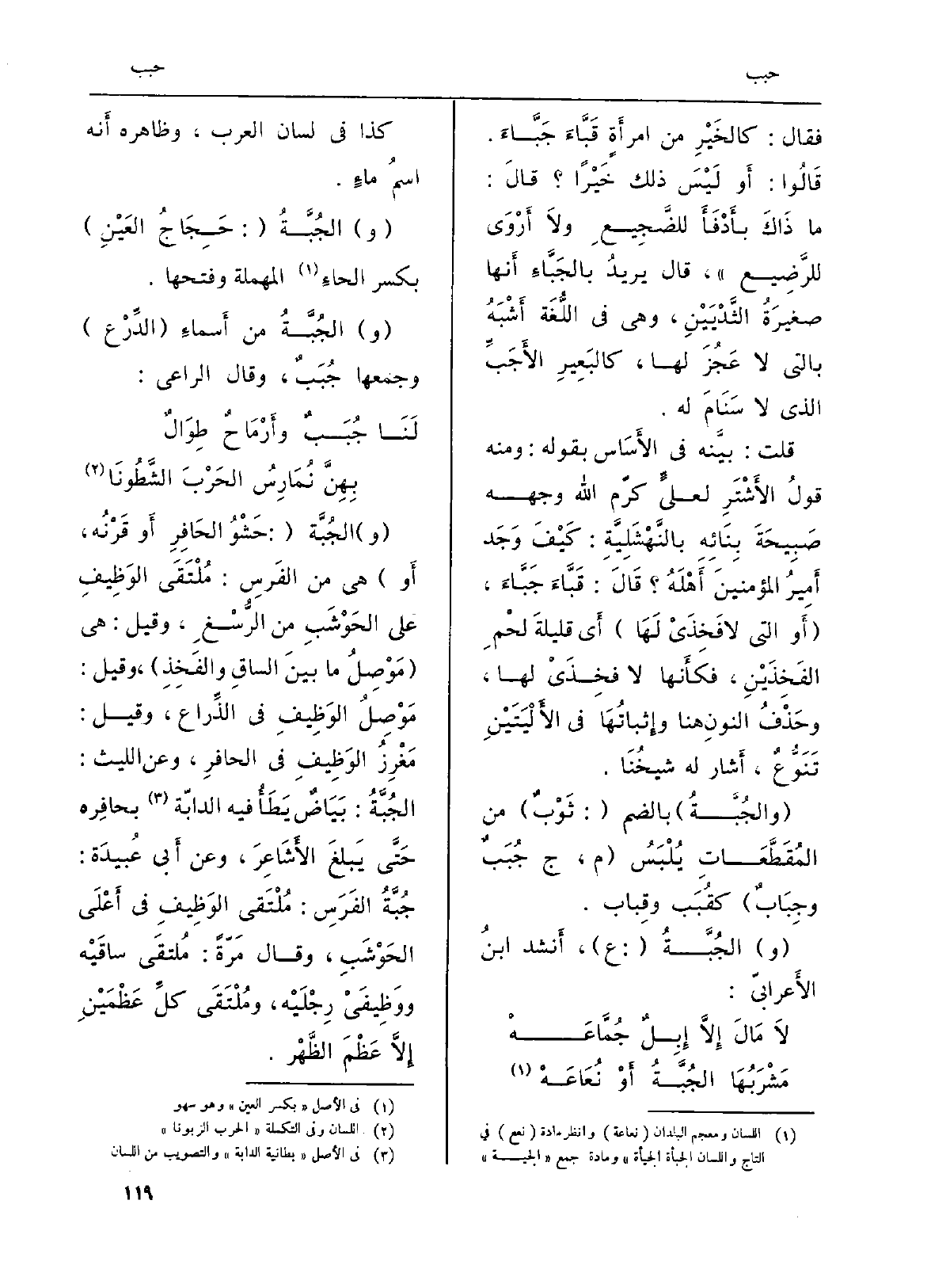 (و) الجُبَّة (: حَشْوُ الحَافِرِ أَو قَرْنُه، أَو) هِيَ من الفَرسِ: مُلْتَقَى الوَظِيفِ على الحَوْشَبِ من الرُّسْغِ، وَقيل: هِيَ (مَوْصِلُ مَا بينَ الساقِ والفَخِذِ) ، وَقيل: مَوْصِلُ الوَظِيفِ فِي الذِّراع، وَقيل: مَغْرِزُ الوَظِيفِ فِي الحافِرِ، وَعَن اللَّيْث: الجُبَّةُ: بَيَاضٌ يَطَأُ فِيهِ الدابّة بحافِره حَتَّى يَبلغَ الأَشَاعِرَ، وَعَن أَبي عُبَيدَة: جُبَّةُ الفَرَسِ: مُلْتَقى الوَظِيفِ فِي أَعْلَى الحَوْشَبِ، وَقَالَ مَرةً: مُلْتقَى ساقَيْه وَوَظِيفَيْ رِجْلَيْه، ومُلْتَقَى كلِّ عَظْمَيْنِ إِلاَّ عَظْمَ الظَهْر.