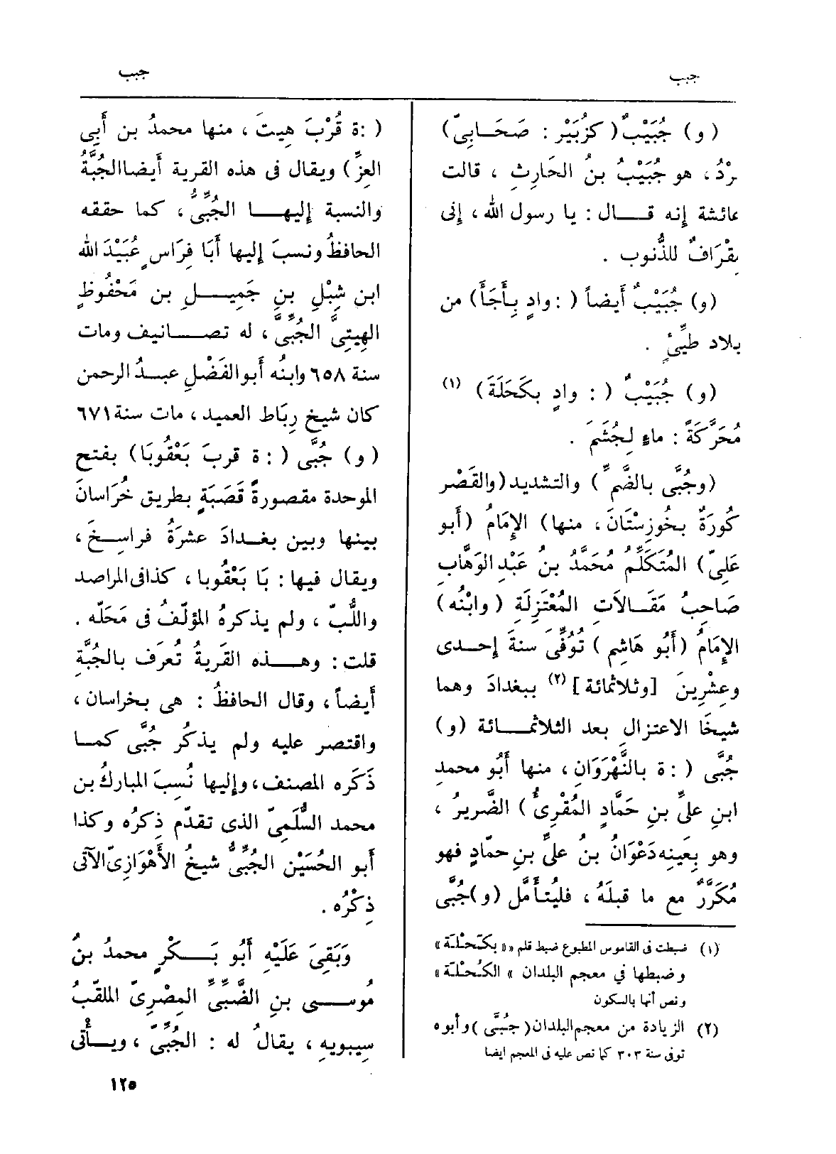(} وجُبَّى بالضَّمِّ) وَالتَّشْدِيد (والقَصْر كُورَةٌ بخُوزِسْتَانَ، مِنْهَا) الإِمَامُ (أَبو عَلِيّ) المُتَكَلِّمُ مُحَمَّدُ بنُ عَبْدِ الوَهَّابِ صَاحِبُ مَقَالاَتِ المُعْتَزِلَةِ (وابْنُه) الإِمَامُ (أَبُو هَاشِم) تُوُفِّيَ سنةَ إِحدى وعِشْرِينَ (وثلاثمائة) ببغدادَ وهما شَيخا الاعتزالِ بعد الثلاثمائة (و) جُبَّى (: ة بالنَّهْرَوَانِ، مِنْهَا أَبُو محمدِ بنِ عليِّ بن حَمَّادٍ المُقْرِىءٌ) الضَّريرُ، وَهُوَ بِعَيْنِه دَعْوَا بنُ عليِّ بنِ حمّادٍ فَهُوَ مُكَرَّرٌ مَعَ مَا قبلَهُ، فليُتأَمَّل (و) جُبَّى (: ة قُرْبَ هِيتَ، مِنْهَا محمدُ بن أَبي العِزَّ) وَيُقَال فِي هَذِه الْقرْيَة أَيضاً الجُبَّةُ وَالنِّسْبَة إِليها! - الجُبِّيُّ، كَمَا حَقَّقَهُ الحافظُ ونسبَ إِليها أَبَا فِرَاسٍ عُبَيْدَ الله بن شِبْلِ بنِ جَمِيلِ بن مَحْفُوظٍ الهِيتِيَّ الجُبِّيَّ، لَهُ تصانيف وَمَات سنة 658 وابنُه أَبو الفَضْلِ عبدُ الرَّحْمَن كَانَ شيخ رِبَاط العميد، مَاتَ سنة 67 (و) جُبَّى (: ة قربَ بَعْقُوبَا) بِفَتْح الْمُوَحدَة مَقْصُورَة قَصَبَةٍ بطرِيق خُرَاسَانَ بَينهَا وَبَين بغدادَ عشرَةُ فراسِخَ، وَيُقَال فِيهَا: بَا بَعْقُوبا، كَذَا فِي المراصد واللُّبّ، وَلم يذكرهُ المؤلّفُ فِي مَحَلّه. قلت: وَهَذِه القَريةُ تُعرَف بالجُبَّةِ أَيضاً، وَقَالَ الحافظُ: هِيَ بخراسان، وَاقْتصر عَلَيْهِ وَلم يذكُر جُبَّى كَمَا ذَكَره المُصَنّف، وإِليها نُسِبَ المباركُ بن محمدٍ السُّلَمِيّ الَّذِي تقدّم ذِكرُه وَكَذَا أَبو الحُسَيْن الجُبِّيُّ شيخُ الأَهْوَازِيّ الْآتِي ذِكْرُه.