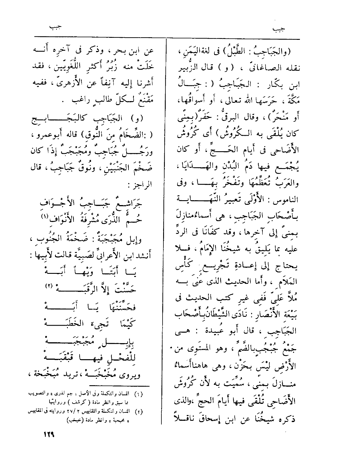 (والجَبَاجِبُ: الطَّبْلُ) فِي لُغَة اليَمَنِ، نَقله الصاغانيّ، (و) قَالَ الزُّبير بن بكّار: الجَبَاجِبُ (: جِبَالُ مَكَّةَ، حَرَسَهَا الله تَعَالَى، أَو أَسواقُها، أَو مَنْحَرٌ) ، وَقَالَ البرقيُّ: حَفَرٌ (بِمِنًى كَانَ يُلْقَى بِهِ الكُرُوشُ) أَي كُرُوشُ الأَضَاحي فِي أَيام الحَجِّ، أَو كَانَ يُجْمَع فِيهَا دَمُ البُدْنِ والهَدَايَا، والعَرَبُ تُعَظِّمُهَا وتَفْخَرُ بِهَا، وَفِي الناموس: الأَوْلَى تَعْبيرُ النّهَاية بأَصْحَابِ الجَبَاجِبِ، هِيَ أَسماءُ منازِلَ بمِنًى إِلى آخِرها، وَقد كفَانَا فِي الردِّ عَلَيْهِ بِمَا يَلِيقُ بِهِ شيخُنَا الإِمَامُ، فَلَا يحْتَاج إِلى إِعادةِ تَجْرِيعِ كَأْسِ المَلامِ، وأَما الحَدِيث الَّذِي عُنيَ بِهِ مُلاَّ عَلِيّ فَفِي غيرِ كتب الحَدِيث فِي بَيْعَةِ الأَنْصَارِ: نَادَى الشَّيْطَانُ بِأَصْحَاب الجَبَاجِبِ، قَالَ أَبو عُبيدة: هِيَ جَمْعُ جُبْجُبٍ بالضَّمِّ، وَهُوَ المستَوِي من الأَرْضِ ليْسَ بحَزْن، وَهِي هَاهُنَا أَسماءُ منازلَ بمِنًى، سُمِّيَت بِهِ لأَن كُرُوشَ الأَضَاحِي تُلْقَى فِيهَا أَيامَ الحجِّ، وَالَّذِي ذكره شيخُنَا عَن ابْن إِسحاقَ نَاقِلا عَن ابْن بَحر، وَذكر فِي آخرِه أَنه خَلَتْ مِنْهُ زُبُرُ أَكثرِ اللُّغَوِيّين، فقد أَشرنا إِليه آنِفاً عَن الأَزهريّ، فَفِيهِ مَقْنَعٌ لكلّ طالبٍ رَاغِب.
