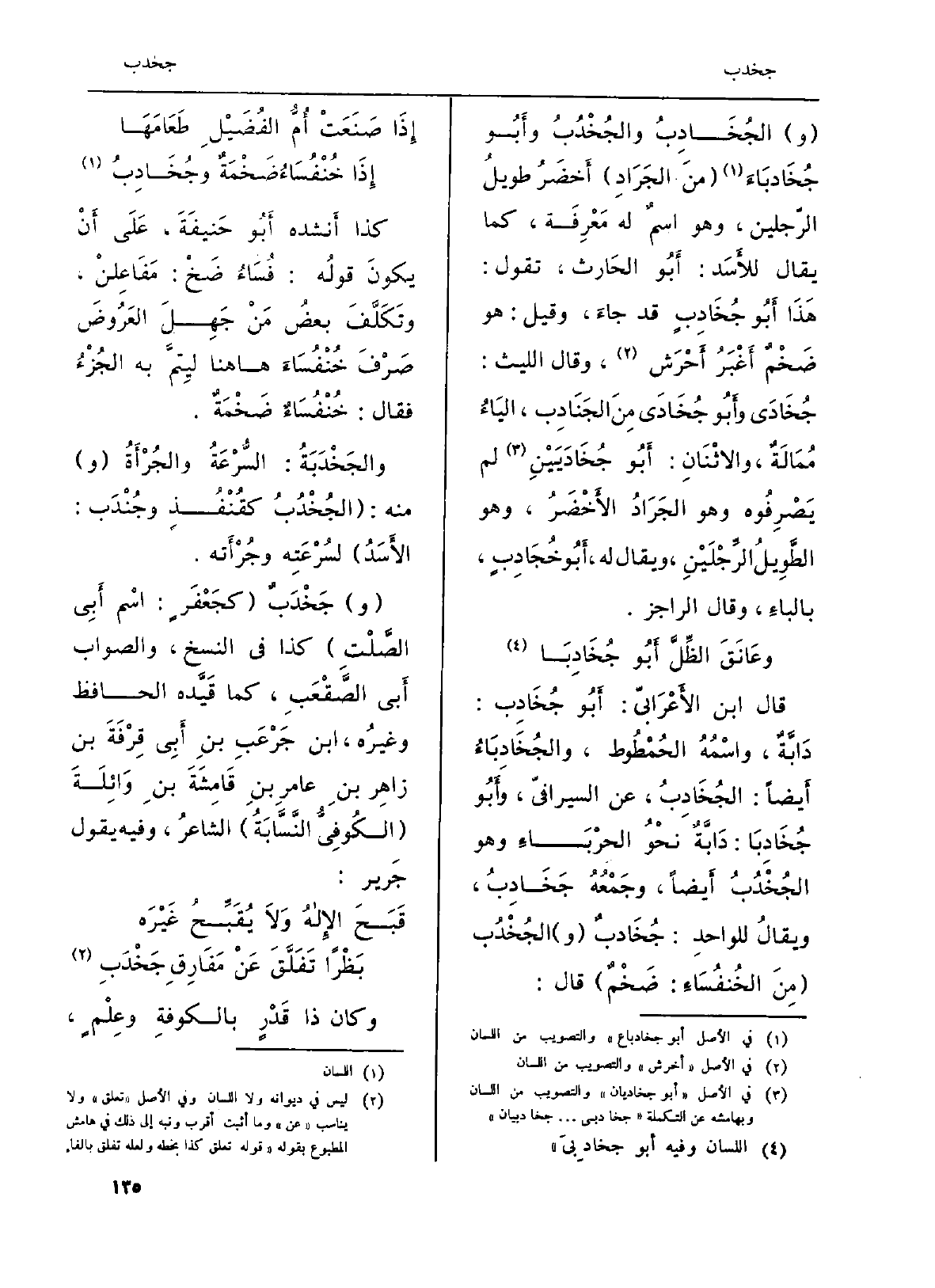 قَالَ ابْن الأَعْرَابيّ: أَبُو جُخَادِب: دَابَّةٌ، واسْمُهُ الحُمْطُوط، والجُخَادِبَاء أَيضاً: الجُخَادِبُ، عَن السيرافيّ، وأَبُو جُخَادِبَا: دَابَّةٌ نَحْوُ الحرْبَاءِ وَهُوَ الجُخْدُبُ أَيضاً، وجَمْعُهُ جَخَادِبُ، ويقالُ للواحدِ: جُخَادبٌ (و) الجُخْدَب (مِنَ الخُنفُسَاءِ: ضَخْمٌ) قَالَ: