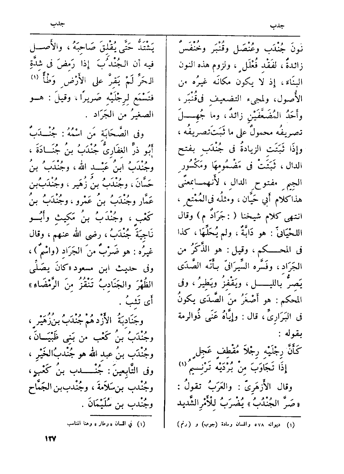 نونَ جُنْدب وعُنْصَل وقُنْبَر وخُنْفَسٌ زائدةٌ، لفَقْدِ فُعْلَلٍ، وَلُزُوم هَذِه النُّون البنَاءَ، إِذ لَا يكون مكانَه غيرُه من الأُصول، ولمجيء التضعيفِ فِي قُنْبَر، وأَحَدُ المُضَعَّفَيْنِ زائدٌ، وَمَا جُهِلَ تصريفُه محمولٌ على مَا ثَبَتَ تصريفُه، وإِذَا ثَبَتَتِ الزيادةُ فِي جُنْدَبِ بِفَتْح الدَّال، ثَبَتَتْ فِي مَضْمُومِهَا ومَكْسُورِ الجِيمِ مفتوحِ الدالِ، لأَنهما بِمَعْنى هَذَا كَلَام أَبي حَيَّان، ومثلُه فِي المُمْتعِ، انْتهى كَلَام شَيخنَا: جَرَادٌ م) وَقَالَ اللحْيَانيّ: هُوَ دَابَّةٌ، وَلم يُحَلِّهَا، كَذَا فِي (الْمُحكم) ، وَقيل: هُوَ الذَّكَرُ من الجَرَادِ، وفَسَّره السِّيرَافيّ بأَنّه الصَّدَى يَصِرُّ بِاللَّيْلِ، ويَقْفِزُ ويَطِيرُ، وَفِي (الْمُحكم) : هُوَ أَصْغَرُ منَ الصَّدَى يكونُ فِي البَرَارِيِّ، قَالَ: وإِيَّاهُ عَنَى ذُو الرمة بقوله: