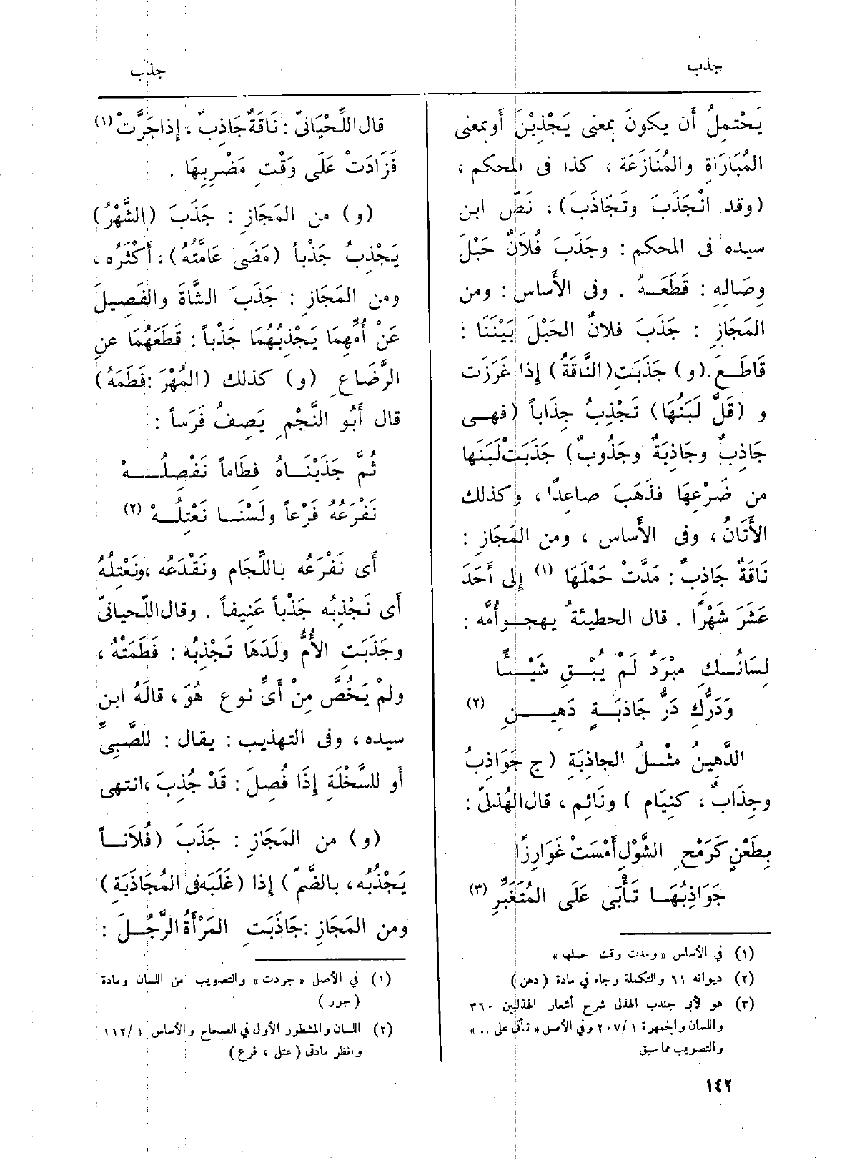 يَحْتَمِلُ أَن يكونَ بِمَعْنى يَجْذِبْنَ أَو بِمَعْنى المُبَارَاةِ والمُنَازَعَة، كَذَا فِي (الْمُحكم) ، (وَقد انْجَذَبَ وتَجَاذَبَ) ، نَصّ ابْن سَيّده فِي (الْمُحكم) : وجَذَبَ فُلاَنٌ حَبْلَ وِصَالِهِ: قَطَعَهُ. وَفِي الأَساس: وَمن المَجَازِ: جَذَبَ فلانٌ الحَبْلَ بَيْنَنَا: قَاطعَ. (و) جَذَبَتِ (النَّاقَةُ) إِذا غَرَزَت و (قَلَّ لَبَنُهَا) تَجْذِبُ جِذَاباً (فَهِيَ جَاذِبٌ وجَاذِبَةٌ وجَذُوبٌ) جَذَبَتْ لَبَنَهَا من ضَرْعِهَا فذَهَبَ صاعِداً، وَكَذَلِكَ الأَتَانُ، وَفِي الأَساس، وَمن المَجَازِ: نَاقَةٌ جَاذِبٌ: مَدَّتْ حَمْلَهَا إِلى أَحَدَ عَشَرَ شَهْراً. قَالَ الحطيئةُ يهجو أُمَّه: