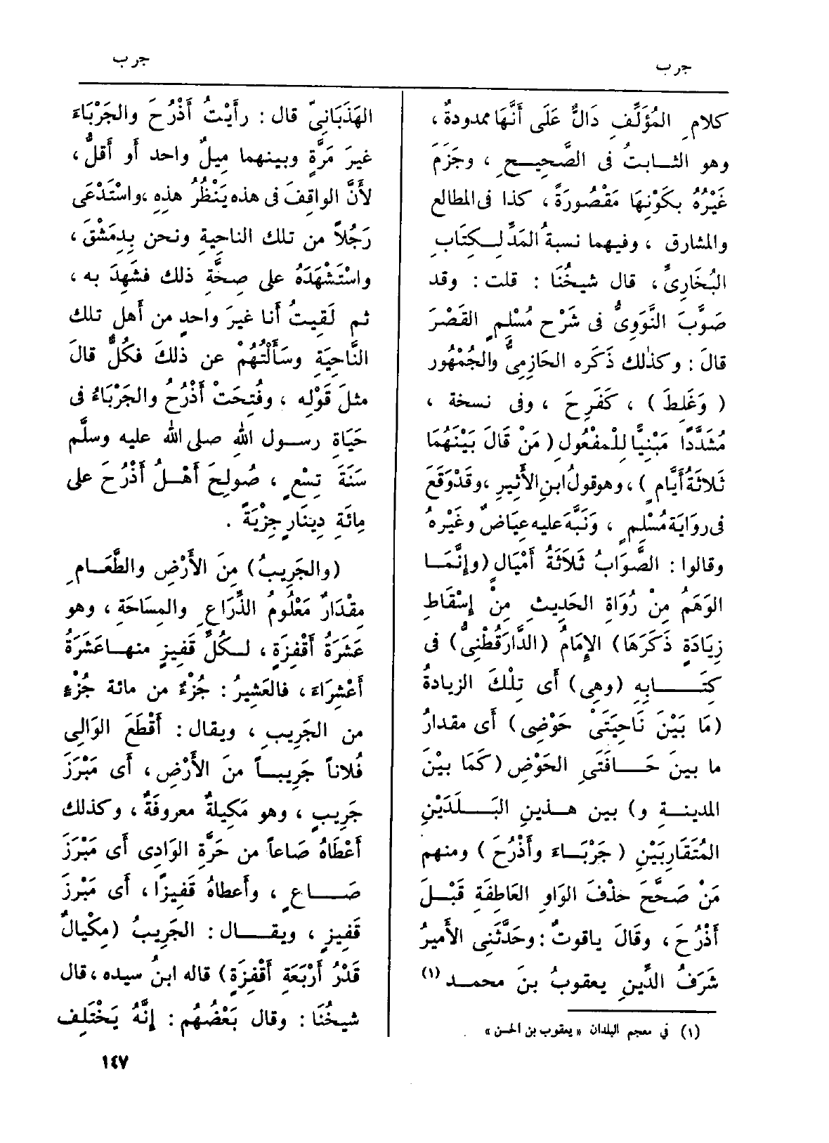 كلامِ المُؤَلِّفِ دَالٌّ عَلَى أَنَّهَا ممدودةٌ، وَهُوَ الثابتُ فِي الصَّحِيحِ، وجَزَمَ غَيْرُهُ بكَوْنِهَا مَقْصُورَةً، كَذَا فِي الْمطَالع والمشارق، وَفِيهِمَا نِسْبَة المَدِّ لِكِتَابِ البُخَارِيِّ، قَالَ شيخُنَا: قلت: وَقد صَوَّبَ النَّوَوِيُّ فِي شَرْح مُسْلِمٍ القَصْرَ قالَ: وكذالك ذَكَره الحَازِمِيُّ والجُمْهُور (وغَلِطَ) ، كَفَرِحَ، وَفِي نُسْخَة، مُشَدَّداً مَبْنِيًّا لِلْمَفْعُولِ (مَنْ قَالَ بَيْنَهُمَا ثَلاَثَةُ أَيَّامٍ) ، وَهُوَ قولُ ابنِ الأَثِيرِ، وقَدْ وَقَعَ فِي روايةَ مُسْلِمٍ، وَنَبَّهَ عَلَيْهِ عِيَاضٌ وغَيْرهُ وَقَالُوا: الصَّوَابُ ثَلاَثَةُ أَمْيَالٍ (وإِنَّمَا الوَهَمُ مِنْ رُوَاةِ الحَدِيثِ مِنْ إِسْقَاطِ زِيَادَةٍ ذَكَرَهَا الإِمَامُ (الدَّارَقُطْنِيُّ) فِي كِتَابِهِ (وهِي) أَي تِلْكَ الزيادةُ (مَا بَيْنَ نَاحِيَتَيْ حَوْضِي) أَي مقدارُ مَا بينَ حَافَتَيِ الحَوْضِ (مَمَا بَيْنَ المدينةِ و) بَين هذينِ البَلَدَيْنِ المُتَقَارِبَيْنِ (جَرْبَاءَ وأَذْرُعَ) وَمِنْهُم مَنْ صَحَّحَ حَذْفَ الوَاوِ العَاطِفَةِ قَبْلَ أَذْرُحَ، وقَالَ ياقوتٌ: وحَدَّثَنِي الأَميرُ شَرَفُ الدِّينِ يعقوبُ بنَ مُحَمَّد الهَذَبَانِيّ قَالَ: رأَيْتُ أَذْرُحَ والجَرْبَاءَ غيرَ مَرَّةٍ وَبَينهمَا مِيلٌ وَاحِد أَو أَقلُّ، لأَنَّ الواقِفَ فِي هَذِه يَنْظُرُ هذِهِ، واسْتَدْعَى رَجُلاً من تِلْكَ الناحِيةِ وَنحن بِدِمَشْقَ، واسْتَشْهَدَهُ على صِحَّةِ ذَلِك فشَهِدَ بِهِ، ثمَّ لَقِيتُ أَنا غيرَ واحدٍ من أَهل تِلْكَ النَّاحِيَةِ وسَأَلْتُهُمْ عَن ذلكَ فكُكٌّ قالَ مثلَ قَوْلِه، وفُتِحَتْ أَذْرُحُ والجَرْبَاءُ فِي حَيَاةِ رَسُول الله صلى الله عَلَيْهِ وسلمسَنَةَ تِسْعٍ، صُولِحَ أَهْلُ أَذْرُحَ على مَائَةِ دِينَارٍ جِزْبَةً.