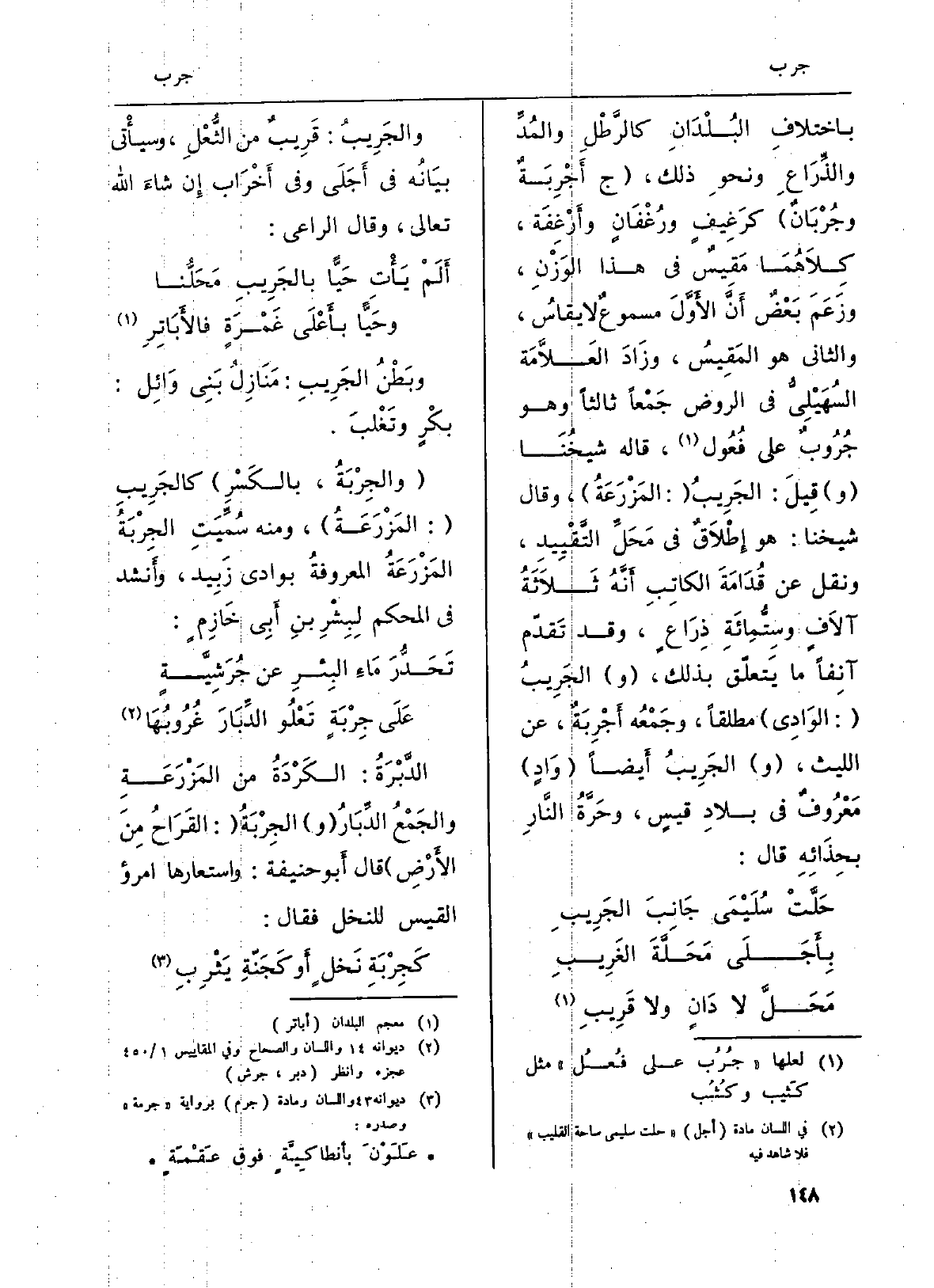 باختلافِ البُلْدَانِ كالرَّطْلِ والمُدِّ والذِّرَاعَ ونحوِ ذَلِك، (ج أَجْرِبَةٌ وجُرْبَانٌ) كرَغِيفٍ ورُغْفَانٍ وأَرْغِفَة، كِلاَهُمَا مَقِيسٌ فِي هَذَا الوَزْنِ، وَزَعَمَ بَعْضٌ أَنَّ الأَوَّلَ مسموعٌ لَا يقاسُ، وَالثَّانِي هُوَ المَقِيسُ، وزَادَ العَلاَّمَة السُهَيْلِيُّ فِي الرَّوْض جَمْعاً ثَالِثا وَهُوَ جُرُوبٌ على فُعُول، قَالَه شيخُنَا (و) قِيلَ: الجَرِيبُ (: المَزْرَعَةُ) ، وَقَالَ شَيخنَا: هُوَ إِطْلاَقٌ فِي مَحَلِّ التَّقْيِيدِ، وَنقل عَن قُدَامَةَ الكاتِب أَنَّهُ ثَلاَثَةُ آلاَفٍ وسِتُّمِائَةِ ذِرَاعٍ، وَقد تَقدّم آنِفاً مَا يَتعلّق بذلك، (و) الجَرِيبَ (: الوَادِي) مُطلقًا، وجَمْعُه أَجْرِبَةٌ عَن اللَّيْث، (و) الجَرِيبُ أَيضاً (وَادٍ) مَعْرُوفٌ فِي بلادِ قيسٍ، وحَرَّةُ النَّارِ بحِذَائِهِ قَالَ: