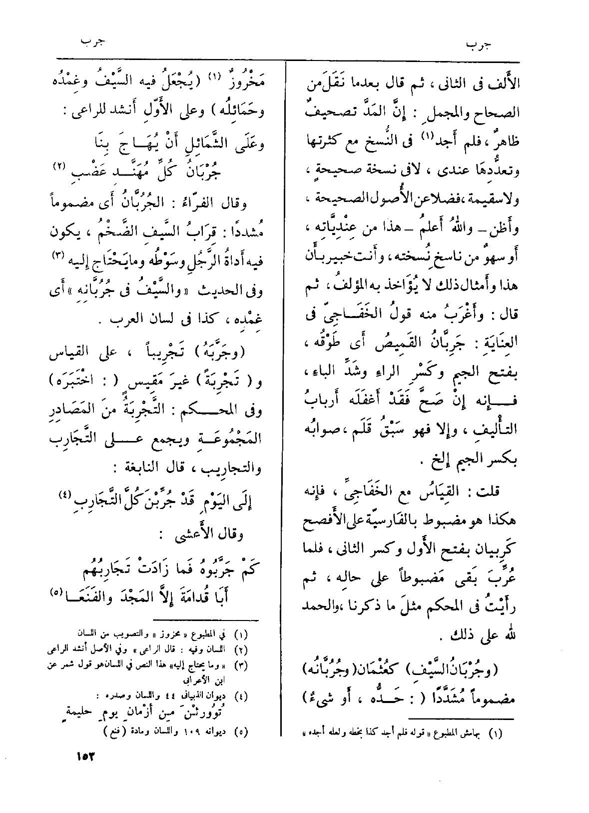 الأَلف فِي الثَّانِي، ثمَّ قَالَ بَعْدَمَا نَقَلَ من (الصِّحَاح والمجملِ) : إِنَّ المَدَّ تصحيفٌ ظاهرٌ، فَلم أَجد فِي النُّسخ مَعَ كثرتها وتعدُّدِها عِنْدِي، لَا فِي نُسْخَة صحيحةٍ، وَلَا سقيمة، فضلا عَن الأُصول الصَّحِيحَة، وأَظن واللَّهُ أَعلمُ هَذَا من عِنْدِيَّاتِه، أَو سهوٌ من ناسخِ نُسْخته، وأَنت خَبِير بأَن هَذَا وأَمثال ذَلِك لَا يُؤَاخذ بِهِ المؤلفُ، ثمَّ قَالَ: وأَغْرَبُ مِنْهُ قولُ الخَفَاجِيّ فِي العِنَايَةِ: جَرِبَّانُ القَمِيصُ أَي طَوْقُه، بِفَتْح الْجِيم وكَسْرِ الراءِ وشَدِّ الباءِ، فإِنه إِنْ صَحَّ فَقَدْ أَغْفَلَه أَربابُ التأْليفِ، وإِلا فَهُوَ سَبْقُ قَلَم، صوابُه بِكَسْر الْجِيم إِلخ.