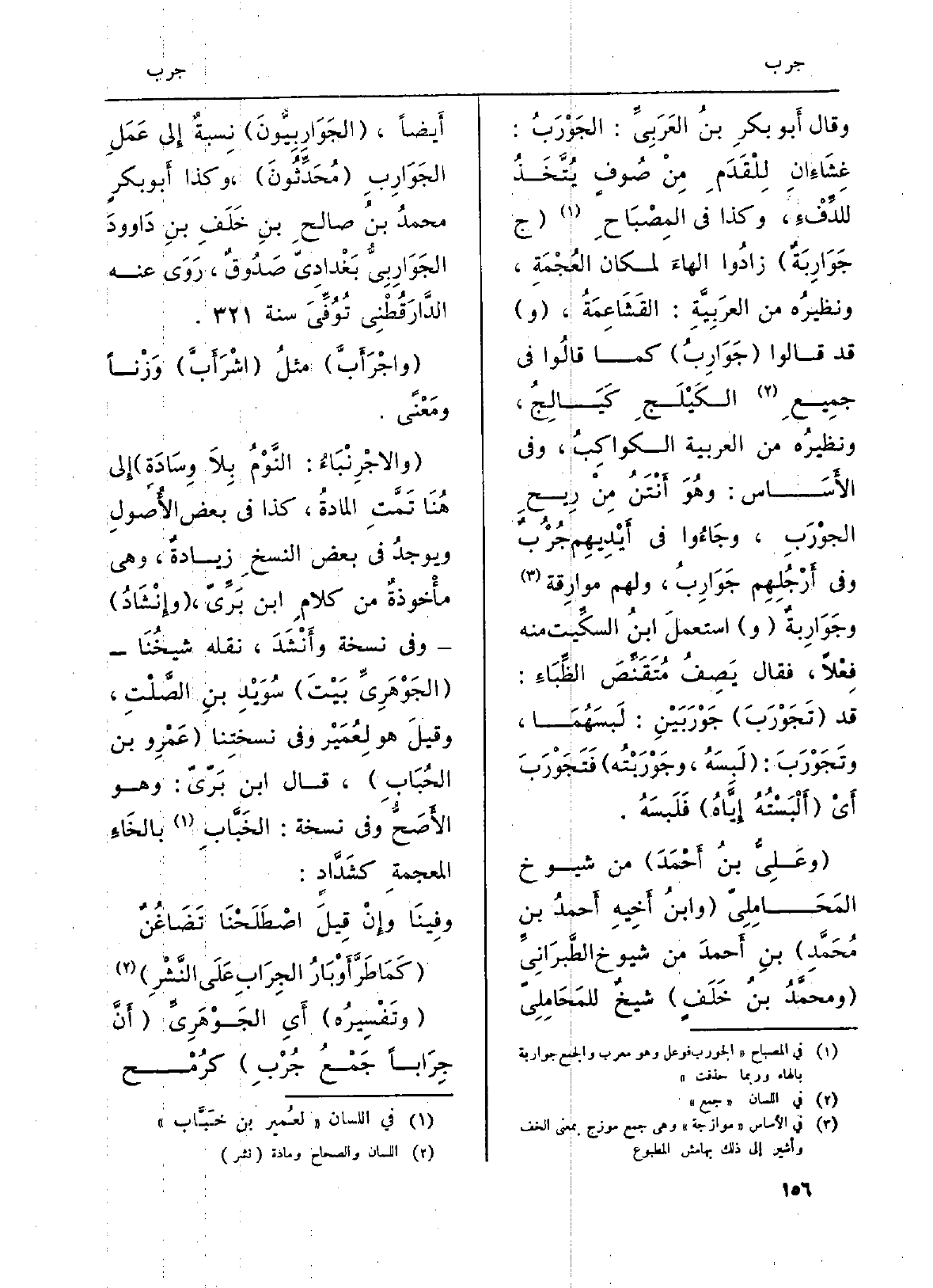 وَقَالَ أَبو بكرِ بنُ العَرَبِيِّ: الجَوْرَبُ: غِشَاءانِ لِلْقَدَمِ مِنْ صُوفٍ يُتَّخَذُ للدِّفْءِ، وَكَذَا فِي (المِصْبَاحِ) (ج جَوَارِبَةٌ) زادُوا الهاءَ لمَكَان العُجْمَةِ، ونظيرُه من العرَبِيَّةِ: القَشَاعِمَةُ، (و) قد قَالُوا (جَوَارِبُ) كَمَا قالُوا فِي جمِيعِ الكَيْلَجِ كَيَالِجُ، ونظيرُه من الْعَرَبيَّة الكواكِبُ، وَفِي الأَسَاس: وهُوَ أَنْتَنُ مِنْ رِيحِ الجوْرَبِ، وجَاءُوا فِي أَيْدِيهِمْ جُرْبٌ وَفِي أَرْجُلِهِم جَوَارِبُ، وَلَهُم موارِقة وجَوَارِبةٌ (و) استعملَ ابنُ السكِّيت مِنْهُ فِعْلاً، فَقَالَ يَصِفُ مُتَقَنِّصَ الظِّبَاءِ: قد (تَجَوْرَبَ) جَوْرَبَيْنِ: لَبَسَهُمَا، وتَجَوْرَبَ: (لَبَسَهُ، وجَوْرَبْتُه) فَتَجَوْرَبَ أَيْ (أَلْبَسْتُهُ إِيَّاهُ) فَلَبسَهُ.