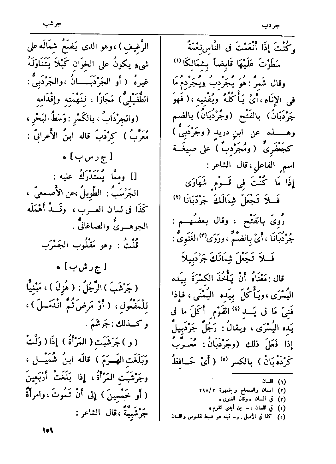 وَقَالَ شَمِرٌ: هُوَ يُجَرْدِبُ ويُجَرْدِمُ مَا فِي الإِنَاءِ، أَيْ يَأْكُلُهُ ويُفْنِيهِ، (فَهوَ جَرْدَبَانُ) بالفَتْح (وجُرْدُبَانُ) بِالضَّمِّ وَهَذِه عَن ابنِ دريدٍ (وجَرْدَبِيٌّ كجَعْفَرِيَ (ومُجَرْدِبٌ) على صِيغَة اسْم الْفَاعِل، قَالَ الشَّاعِر:
