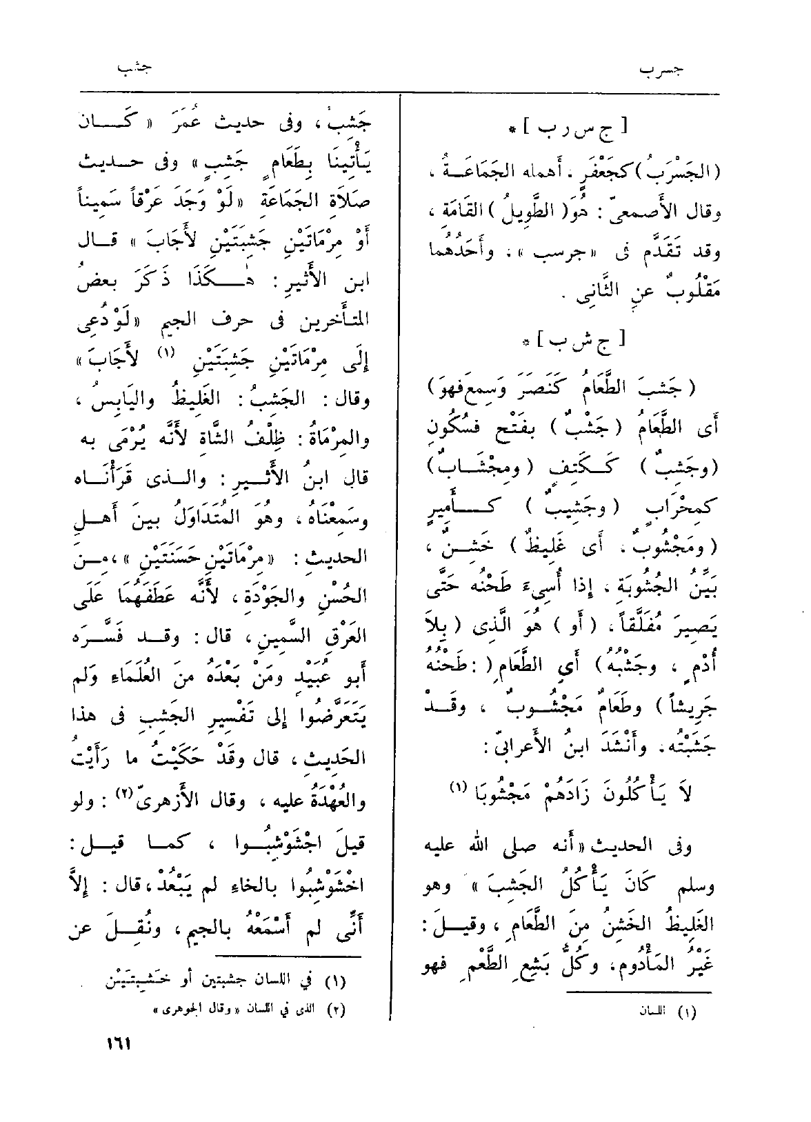 وَفِي الحَدِيث (أَنه صلى الله عَلَيْهِ وسلمكَانَ يَأْكُلُ الجَشِبَ) وَهُوَ الغَلِيظُ الخَشِنُ مِنَ الطَّعَامِ، وقيلَ: غَيْرُ المَأْدُوم، وكُلُّ بَشِعِ الطَّعْمِ فَهُوَ جَشِب، وَفِي حَدِيث عُمَرَ (كَان يَأْتِينَا بِطَعَامٍ جَشِبٍ) وَفِي حَدِيث صَلاَةِ الجَمَاعَةِ (لَوْ وَجَدَ عَرْقاً سَمِيناً أَوْ مِرْمَاتَينِ جَشِبَتَيْنِ لأَجَابَ) قَالَ ابْن الأَثيرِ: هكَذَا ذَكَرَ بعضُ المتأَخرين فِي حرف الْجِيم (لَوْ دُعِي إِلَى مِرْمَاتَيْنِ جَشِبَتَيْنِ لأَجَابَ) وَقَالَ: الجَشِبُ: الغَلِيظُ واليَابِسُ، والمِرْمعاةُ: ظِلْفُ الشَّاةِ لآنَّه يُرْمَى بِهِ قَالَ ابنُ الأَثيرِ: وَالَّذِي قَرَأْنَاه وسَمِعْنَاهُ، وهُوَ المُتَدَاوَلُ بينَ أَهلِ الحَدِيث: (مِرْمَاتَينِ حَسَنَتَيْنِ) ، مِنَ الحُسْنِ والجَوْدَةِ، لأَنَّه عَطَفَهُمَا عَلَ العَرْقِ السَّمِينِ، قَالَ: وَقد فَسَّرَه أَبو عُبَيْدٍ ومَنْ بَعْدَهُ منَ العُلَمعاءِ وَلم يَتَعَرَّضُوا إِلى تَفْسِيرِ الجَشِبِ فِي هَذَا الحدِيثِ، قَالَ وقَدْ حَكَيْتُ مَا رَأَيْتُ والعُهْدَةُ عَلَيْهِ، وَقَالَ الأَزهريّ: وَلَو قيلَ اجْشَوْشِبُوا، كَمَا قيل: اخْشَوْشِبُوا بالخاءِ لم يَبْعُدْ، قَالَ: إِلاَّ أَنِّي لم أَسْمَعْهُ بِالْجِيم، ونُقِلَ عَن