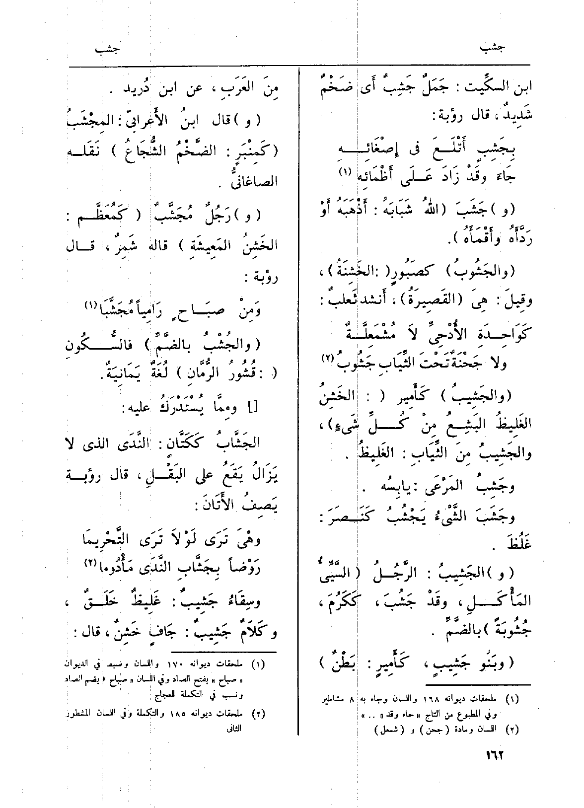 وسِقَاءُ جَشِيبٌ: غَلِيظٌ خَلَقٌ، وكَلاَمٌ جَشِيبٌ. جَافٍ خَشِنٌ، قَالَ: