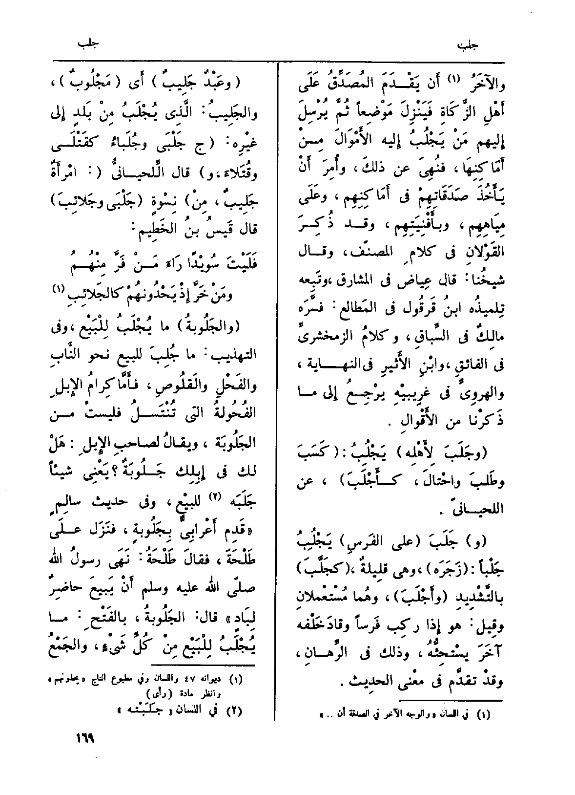 (والجَلُوبةُ) مَا يُجْلَبُ لِلْبَيْع، وَفِي (التَّهْذِيب) : مَا جُلِبَ لليع نَحْو النَّابِ والفَحْلِ والقَلُوصِ، فأَمَّا كِرامُ الإِبلِ الفُحُولةُ الَّتِي تُنْتَسلُ فليستْ من الجَلُوبَة، ويقالُ لصاحبِ الإِبلِ: هَلْ لَك فِي إِبِلِك جَلُوبَةٌ؟ يَعْنِي شَيْئا جَلَبَه للبيْع، وَفِي حَدِيث سالِمٍ (قدِمَ أَعْرابِيٌّ بِجَلُوبةٍ، فنَزَل علَى طَلْحَةَ، فقالَ طَلْحَةُ: نَهَى رسولُ الله صلى الله عَلَيْهِ وسلمأَنْ يَبيعَ حاضرٌ لِبادٍ) قَالَ: الجَلُوبةُ، بالفَتْحِ: مَا يُجْلَبُ لِلْبَيْع مِنْ كُلِّ شَيْءٍ، والجَمْعُ
