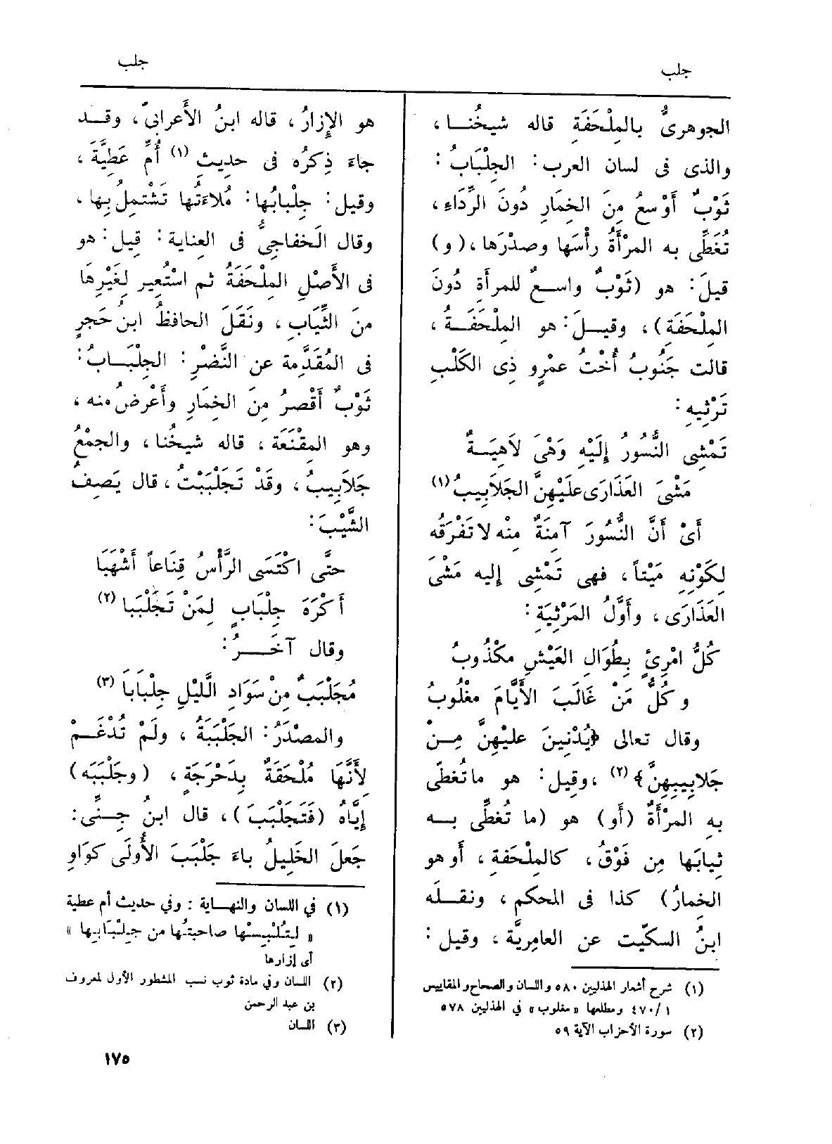 وَقَالَ تَعَالَى: {يُدْنِينَ عَلَيْهِنَّ مِن جَلَابِيبِهِنَّ} (الأَحزاب: 59) ، وَقيل: هُوَ مَا تُغطّي بهِ المرْأَةٌ (أَو) هُوَ (مَا تُغطِّي بِهِ ثِيابَها مِن فَوْقُ، كالمِلْحَفةِ، أَو هُوَ الخِمارُ) كَذَا فِي (الْمُحكم) ، ونقلَه ابنُ السكّيت عَن العامِريَّة، وَقيل: هُوَ الإِزارُ، قَالَه ابنُ الأَعرابيّ، وَقد جاءَ ذِكرُه فِي حديثِ أُمِّ عَطِيَّةَ، وَقيل: جِلْبابُها: مُلاءَتُها تَشْتمِل بِها، وَقَالَ الخفاجِيُّ فِي العِناية: قِيل: هُوَ فِي الأَصْلِ المِلْحَفَةُ ثمَّ اسْتُعِير لِغَيْرِهَا منَ الثِّيَابِ، ونَقَلَ الحافظُ ابنُ حَجرٍ فِي المُقَدَّمة عَن النَّضْرِ: الجِلْبَابُ: ثَوْبٌ أَقْصرُ مِنَ الخِمَارِ وأَعْرضُ مِنْهُ، وَهُوَ المِقْنَعَة، قَالَه شيخُنا، والجمْعُ جَلاَبِيبُ، وقَدْ تَجعلْبَبْتُ، قَالَ يَصِفُ الشَّيْبَ: