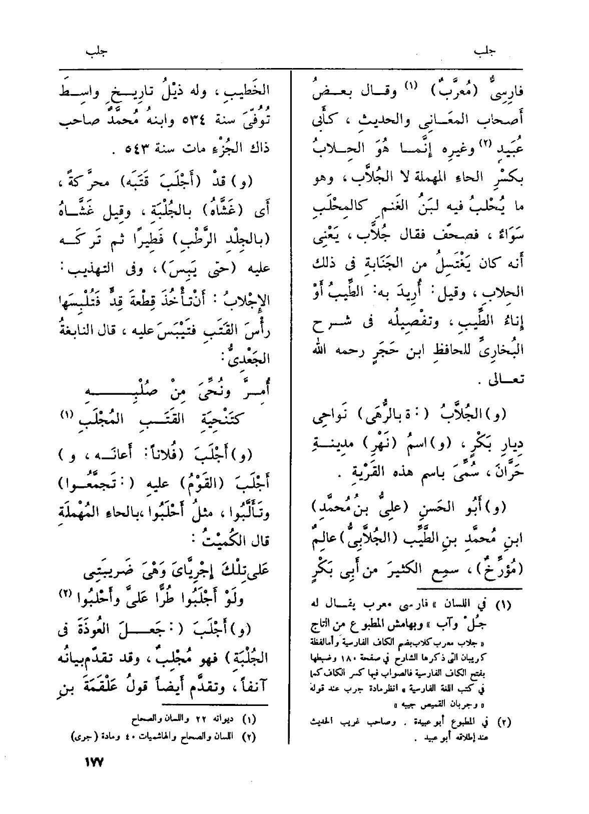 فارِسِيٌّ (مُعرَّبٌ) وَقَالَ بعضُ أَصحاب المعَانِي والحديثِ كأَبي عُبَيدٍ وغيرِه إِنَّما هُوَ الحِلابُ بكسْرِ الحاءِ الْمُهْملَة لَا الجُلاَّب، وَهُوَ مَا يُحْلبُ فِيهِ لبَنُ الغَنمِ كالمِحْلَبِ سَوَاءٌ، فصحّف فَقَالَ جُلاَّب، يَعْنِي أَنه كَانَ يَغْتَسِلُ من الجَنَابةِ فِي ذَلِك الحِلابِ، وَقيل: أُرِيدَ بِهِ: الطَّيبُ أَوْ إِناءُ الطَّيبِ، وتفْصِيلُه فِي (شرح البُخارِيِّ) للحافظِ ابْن حَجَزٍ رَحمَه الله تَعَالَى.