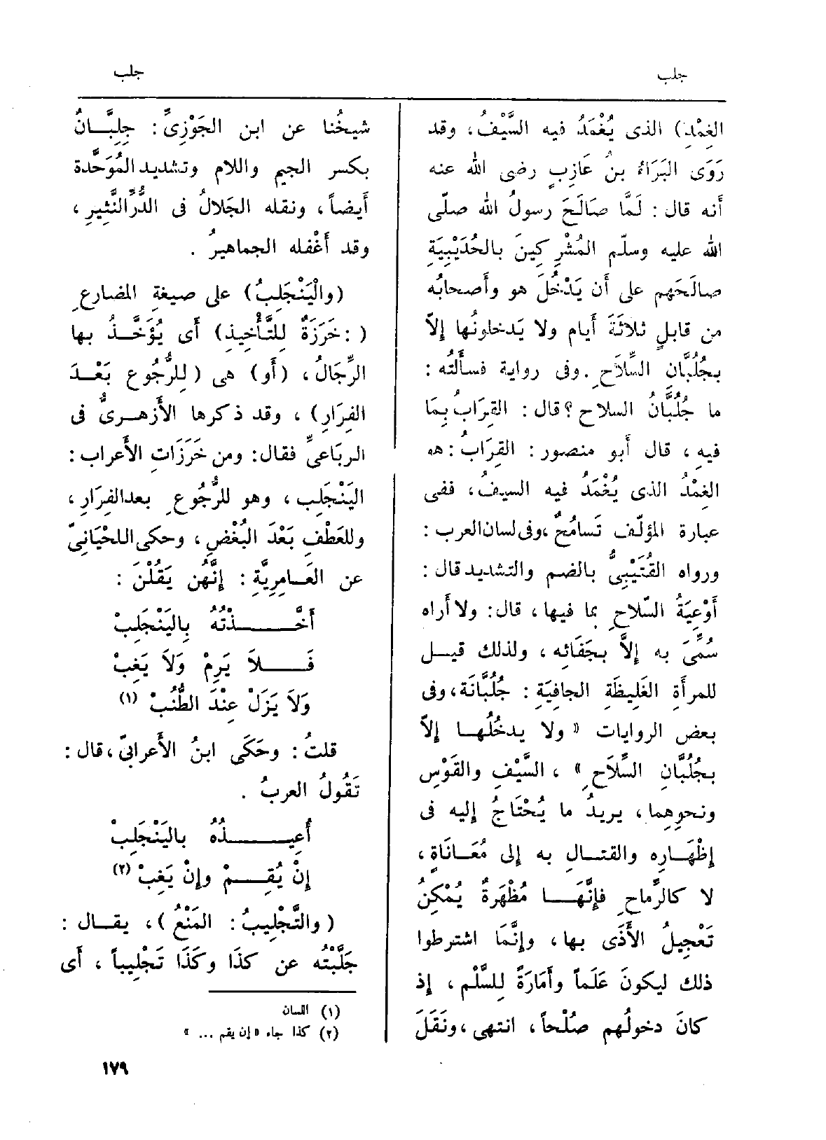 الغِمْدِ) الَّذِي يُغْمَدُ فِيهِ السَّيْفُ، وَقد رَوَى البَرَاءُ بنُ عَازِبٍ رَضِي الله عَنهُ أَنه قَالَ: لَمَّا صَالَحَ رسولُ الله صلى الله عَلَيْهِ وسلمالمُشْرِكِينَ بالحُدَيْبِيَةِ صالَحَهم على أَن يَدْخُلَ هُوَ وأَصحابُه من قابلٍ ثلاثَةَ أَيام وَلَا يَدخلونها إِلاّ بجُلُبَّانِ السَّلاَحِ. وَفِي رِوَايَة فسأَلتُه: مَا جُلُبَّانُ السِّلَاح؟ قَالَ: القِرَابُ بِمَا فيهِ، قَالَ أَبو مَنْصُور: القِرَابُ: هُوَ الغِمْدُ الَّذِي يُغْمَدُ فِيهِ السيفُ، فَفِي عبارَة المؤلّف تَسامُحٌ، وَفِي (لِسَان الْعَرَب) : وَرَوَاهُ القُتَيْبِيُّ بِالضَّمِّ وَالتَّشْدِيد قَالَ: أَوْعِيَةُ السّلاحِ بِمَا فِيهَا، قَالَ: وَلَا أَراه سُمِّيَ بِهِ إِلاَّ بجَفَائِه، وَلذَلِك قيل للمرأَة الغَليظَةِ الجافِيَةِ: جُلُبَّانَة، وَفِي بعض الرِّوَايَات (وَلَا يدخُلُها إِلاّ بجُلُبَّانِ السَّلاحِ) ، السَّيْفِ والقَوْسِ ونحوِهِما، يريدُ مَا يُحْتَاجُ إِليه فِي إِظْهَارِه والقتالِ بِهِ إِلى مُعَانَاةٍ، لَا كالرِّماحِ فإِنَّهَا مُظْهَرةٌ يُمْكِنُ تَعْجِيلُ الأَذَى بهَا، وإِنَّمَا اشترطوا ذَلِك ليكونَ عَلَماً وأَمَارَةً لَهُ لسَّلْم، إِذ كانَ دخولُهم صُلْحاً، انْتهى، ونَقَلَ شيخُنا عَن ابْن الجَوْزِيِّ: جِلِبَّار بِكَسْر الْجِيم وَاللَّام وَتَشْديد المُوَحَّدة أَيضاً، وَنَقله الجَلالُ فِي الدُّرِّ النَّثِيرِ وَقد أَغْفله الجماهيرُ.