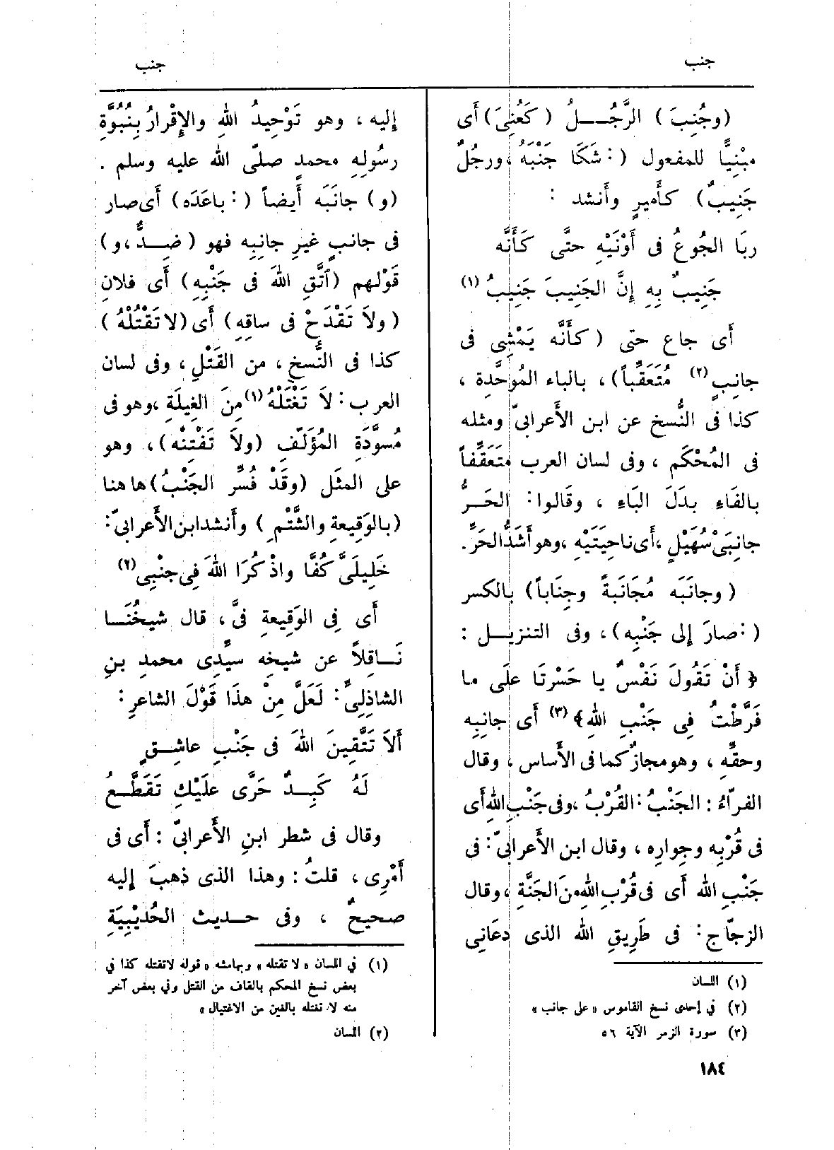 (وجانَبَه مُجَانَبةً وجِنَاباً) بِالْكَسْرِ (: صارَ إِلى جَنْبِه) ، وَفِي التَّنْزِيل: {2. 014 اءَن تَقول نفس. . ا} (الزمر: 56) أَي جانِبِه وحقِّهِ، وَهُوَ مجازٌ كَمَا فِي الأَساس، وَقَالَ الفرّاءُ: الجَنْبُ: القُرْبُ، وَفِي جَنْبِ اللَّهِ أَي فِي قُرْبِه وجِوارِه، وَقَالَ ابْن الأَعرابيّ: فِي جَنْبِ الله أَي فِي قُرْبِ اللَّهِ مِنَ الجَنَّةِ، وَقَالَ الزجّاج: فِي طَرِيقِ الله الَّذِي دَعَانِي إِليه، وَهُوَ تَوْحِيدُ اللَّهِ والإِقْرارُ بِنُبُوَّةِ رسُولِهِ محمدٍ صلى الله عَلَيْهِ وَسلم (و) جانَبَه أَيضاً (: باعَدَه) أَي صَار فِي جانبٍ غيرِ جانِبِ فَهُوَ (ضِدٌّ، و) قَوْلهم (اتَّقِ اللَّهَ فِي جَنْبِهِ) أَي فلانِ (ولاَ تَقْدَحْ فِي ساقِهِ) أَي (لَا تَقْتُلْهُ) كَذَا فِي (النُّسخ) من القَتْلِ، وَفِي (لِسَان الْعَرَب) : لاَ تَغْتَلْهُ مِنَ الغِيلَةِ، وَهُوَ فِي مُسوَّدَةِ المُؤَلّفِ (ولاَ تَفْتِنْه) ، وَهُوَ على المثَل (وقَدْ فُسِّر الجَنْبُ) : هَا هُنَا (بالوَقِيعَةِ والشَّتْمِ) وأَنشد ابْن الأَعرابيّ: