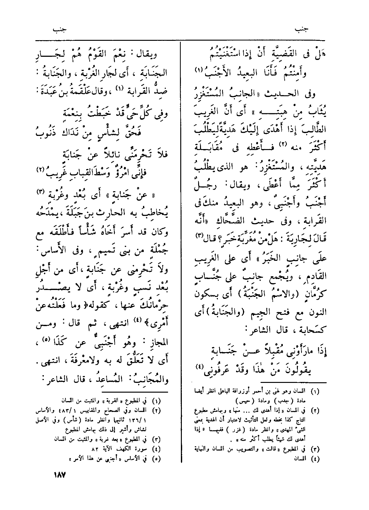 وَفِي الحَدِيث (الجانِبُ المُسْتَغْزِرُ يُثَابُ مِنْ هِبَتِهِ) أَي أَنَّ الغَرِيبَ الطَّالِبَ إِذا أَهْدَى إِلَيْكَ هَدِيَّةً لِيَطْلُبَ أَكْثَرَ مِنْهُ فأَعْطِهِ فِي مُقَابَلَةِ هَدِيَّتِهِ، والمُسْتَغْزِرُ: هُوَ الَّذِي يطْلُبُ أَكْثَرَ مِمَّا أَعْطَى، وَيُقَال: رجُلٌ أَجْنَبُ وأَجْنَبِيٌ، وَهُوَ البعِيدُ منكَ فِي القَرابةِ، وَفِي حَدِيث الضَّحَّاكِ (أَنَّه قَالَ لِجَارِيَةَ: هَلْ منْ مُغَرِّبَةِ خَبَرٍ؟ قَالَ علَى جانِبِ الخَبَرُ) أَي على الغَرِيبِ القَادِمِ، ويُجْمَع جانِبٌ على جُنَّابٍ كرُمَّانٍ (والاسْمُ الجَنْبَةُ) أَي بِسُكُون النُّون مَعَ فتح الجِيم (والجَنَابةُ) أَي كسَحابة، قَالَ الشَّاعِر: