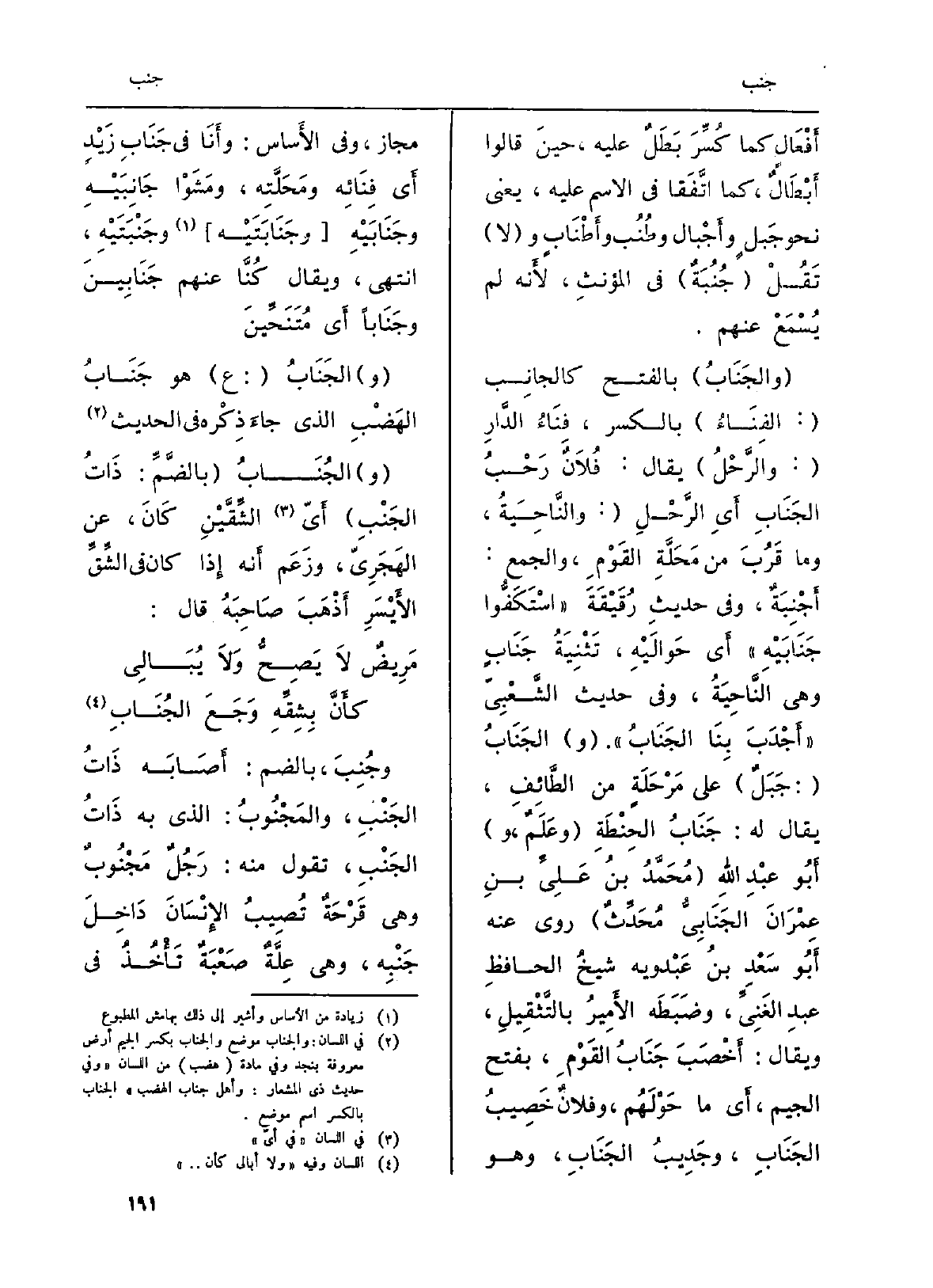 (والجَنَابُ) بِالْفَتْح كالجانِب (: الفِنَاءُ) بِالْكَسْرِ، فِنَاءُ الدَّارِ (: والرَّحْلُ) يُقَال: فُلاَنٌ رَحْبُ الجَنَابِ أَيِ الرَّحْلِ (: والنَّاحِيَةُ، وَمَا قَرُبَ من مَحَلَّةِ القَوْمِ، وَالْجمع: أَجْنِبَةٌ، وَفِي حديثِ رُقَيْقَةَ (اسْتَكَفُّوا جَنَابَيْهِ) أَي حَوَالَيْهِ، تَثْنِيَةُ جَنَابٍ وَهِي النَّاحِيَةُ، وَفِي حَدِيث الشَّعْبِيّ (أَجْدَبَ بِنَا الجَنَابُ) . (و) الجَنَابُ (جَبَلٌ) على مَرْحَلَةٍ من الطَّائِفِ، يُقَال لَهُ: جَنَابُ الحِنْطَةِ (وعَلَمٌ، و) أَبُو عبْدِ اللَّهِ (مُحَمَّدُ بنُ عَلِيِّ بنِ عِنْرَانَ الجَنَابِيُّ مُحَدِّثٌ) روى عَنهُ أَبُو سَعْدِ بنُ عَبْدويه شيخُ الحافظِ عبدِ الغَنِيِّ، وضبَطَه الأَمِيرُ بالتَّثْقِيلِ، وَيُقَال: أَخْصَبَ جَنَابُ القَوْمِ، بِفَتْح الْجِيم، أَي مَا حَوْلَهُم، وفلانٌ خَصِيبُ الجَنَابِ، وجَدِيبُ الجَنَابِ، وَهُوَ مجَاز، وَفِي الأَساس: وأَنا فِي جَنَابِ زَيْدِ أَي فِنَائِه ومَحَلَّتِه، ومَشَوْا جَانِبَيْهِ وجَنَابَيْهِ (وجَنَابَتَيْه) وجَنْبَتَيْهِ، انْتهى، وَيُقَال كُنَّا عَنْهُم جَنَابِينَ وجَنَاباً أَي مُتَنَحِّينَ.