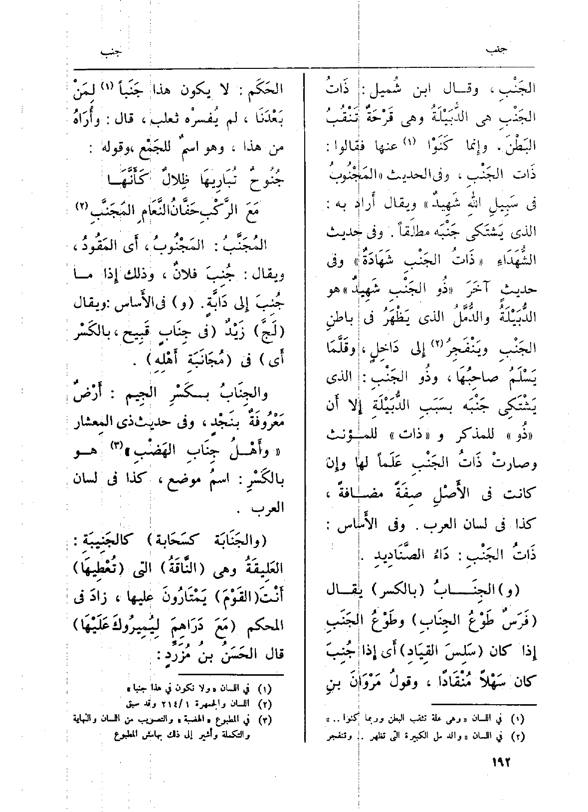 الجَنْبِ، وَقَالَ ابْن شُميل: ذَاتِ الجَنْبِ هِيَ الدُّبَيْلَةُ وَهِي قَرْحَةٌ تَنْقُبُ البَطْنَ، وإِنما كَنَوْا عَنْهَا فَقَالُوا: ذَات الجَنْبِ، وَفِي الحَدِيث (المَجْنُوبُ فِي سَبِيلِ اللَّهِ شَهِيدٌ) وَيُقَال أَراد بِهِ: الَّذِي يَشتَكي جَنْبَه مُطلقًا. وَفِي حَدِيث الشُّهَدَاءِ. (ذَاتُ الجَنْبِ شَهَادَةٌ) وَفِي حديثٍ آخَرَ (ذُو الجَنْبِ شَهِيدٌ) هُوَ الدُّبَيْلَةُ والدُّمَّلُ الَّذِي يَظْهَرُ فِي باطنِ الجَنْبِ ويَنْفَجِرُ إِلى داخِلٍ، وقَلَّمَا يَسْلَمُ صاحِبُهَا، وذُو الجَنْبِ: الَّذِي يَشْتَكِي جَنْبَه بسَبَبِ الدُّبَيْلَةِ إِلا أَن (ذُو) للمذكر و (ذَات) للمؤنث وصارتْ ذَاتُ الجَنْبِ عَلَماً لَهَا وإِن كَانَت فِي الأَصْلِ صِفَةً مُضَافَة، كَذَا فِي (لِسَان الْعَرَب) . وَفِي الأَساس: ذَاتُ الجَنْبِ: دَاءُ الصَّنَادِيدِ.