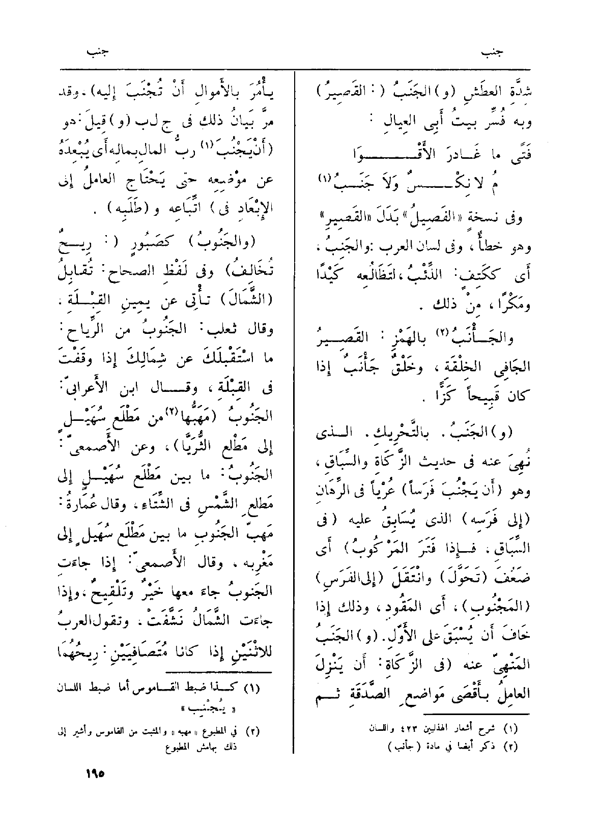 (و) الجَنَبُ، التَّحْرِيكِ، الَّذِي نُهِيَ عَنهُ فِي حَدِيث الزَّكَاةِ والسِّبَاقِ، وَهُوَ (أَن يَجْنُبَ فَرَساً) عُرْياً فِي الرِّهَانِ (إِلى فَرَسِه) الَّذِي يُسَابِقُ عَلَيْهِ (فِي السِّبَاقِ، فإِذا فَتَرَ المَرْكُوبُ) أَي ضَعْفَ (تَحَوَّلَ) وانْتَقَلَ (إِلى الفَرَسِ) (المَجْنُوبِ) أَي المَقُودِ، وَذَلِكَ إِذا خعافَ أَن يُسْبَقَ على الأَوْل. (و) الجَنَبُ المَنْهِيّ عَنهُ (فِي الزَّكَاةِ: أَن يَنْزِلَ العامِلُ بأْقْصَى مَواضعِ الصَّدَقَةِ ثمَّ يأْمُرَ بالأَموالِ أَنْ تُجْنَبَ إِليه) ، وَقد مرَّ بَيانُ ذَلِك فِي جلب (و) قِيلَ: هُوَ (أَنْ يَجْنُبَ ربُّ المالِ بمالِه أَي يُبْعِدَهُ عَن موْضِعِه حَتَّى يَحْتَاج العاملُ إِلى الإِبْعَادِ فِي) اتِّبَاعِه و (طَلَبِه) .