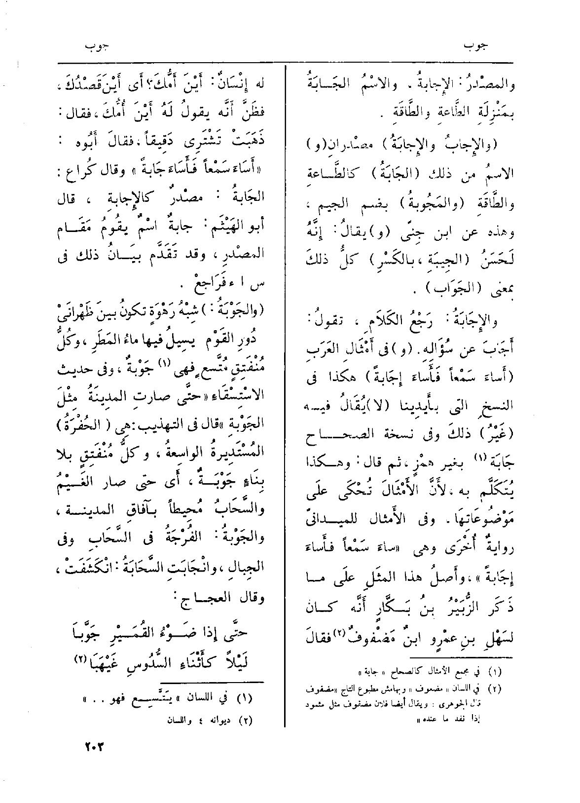 {والإِجَابَةُ: رَجْعُ الكَلاَمِ. تقولُ: أَجَابَ عَن سُؤَالِهِ. (و) فِي أَمْثَالِ العَرَبِ (أَساءَ سَمْعاً فَأَساءَ إِجَابةً) هَكَذَا فِي النسخِ الَّتِي بأَيدِينا (لَا) يُقَالُ فِيهِ (غَيْرُ) ذلكَ وَفِي نُسْخَة الصِّحَاح جَابَة بِغَيْر همْزٍ، ثمَّ قَالَ: وَهَكَذَا يُتَكَلَّم بن، لأَنَّ الأَمْثَالَ تُحْكَى علَى مَوْضُوعَاتِهَا، وَفِي الأَمثال للميدانيُّ روايةٌ أُخْرَى وَهِي (ساءَ سَمْعاً فأَساءَ أَجَابةً) ، وأَصل هَذَا المثَلِ علَى مَا ذَكَر الزُّبَيْرُ بنُ بَكَّارٍ أَنَّه كَانَ لسِهْلِ بنِ عمْرٍ وابنٌ مَضْفوفٌ فقالَ لَهُ أَنْسَانٌ: أَيْنَ أَمُّكَ؟ أَي أَيْنَ قَصْدُكَ، فظَنَّ أَنَّه يقولُ لَهُ أَيْنَ أُمُّكَ، فَقَالَ: ذَهَبَتْ تَشْتَرِي دَقِيقاً، فقالَ أَبُوه: (أَسَاءَ سَمْعاً فَأَسَاءَ جَابةً) وَقَالَ كُراع:} الجَابةُ: مصْدرٌ كالإِجابةِ، قَالَ أَبو الهَيْثَم: جابةٌ اسْمٌ يقُومُ مَقَام المصْدرِ، وَقد تَقَدَّم بيَانُ ذَلِك فِي سَاءَ فَرَاجعْ.