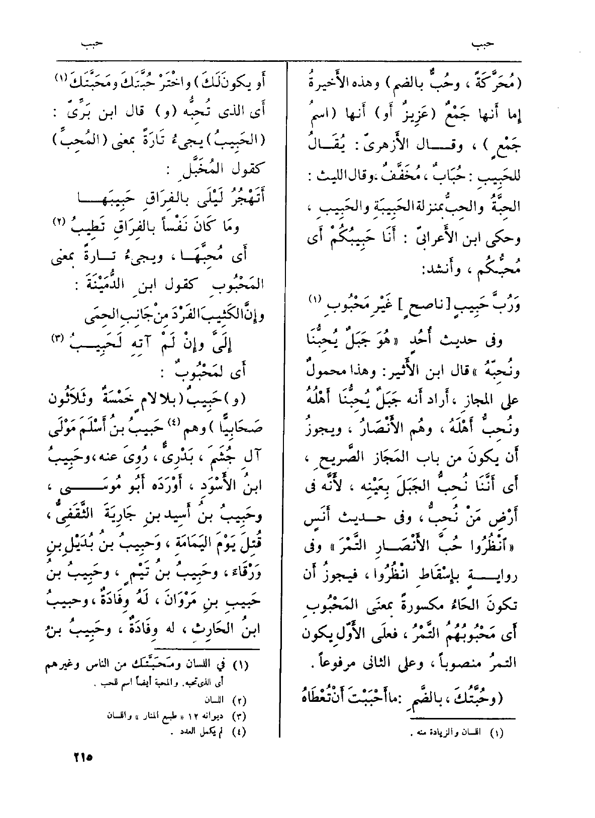 وَفِي حَدِيث أُحُدٍ (هُوَ جَبَلٌ} يُحِبُّنَا {ونُحِبّهُ) قَالَ ابْن الأَثير: وَهَذَا محمولٌ على المجازِ، أَراد أَنه جَبَلٌ يُحِبُّنَا أَهْلُهُ} ونُحِبُّ أَهْلَهُ، وهُم الأَنْصَارُ، ويجوزُ أَن يكونَ من بَاب المَجَاز الصَّريحِ، أَي أَنَّنَا نُحِبُّ الجَبَلَ بِعَيْنِه، لأَنَّه فِي أَرْضِ مَنْ نُحِبُّ، وَفِي حَدِيث أَنَسٍ (انْظُرُوا حُبَّ الأَنْصَارِ التَّمْرَ) وَفِي روايةٍ بإِسْقَاطِ انْظُرُوا، فيجوزُ أَن تكونَ الحَاءُ مَكْسُورَة بمعنَى المَحْبُوبِ أَي مَحْبُوبُهُمُ التَّمْرُ، فعلَى الأَوّلِ يكون التمرُ مَنْصُوبًا، وعَلى الثَّانِي مَرْفُوعا.