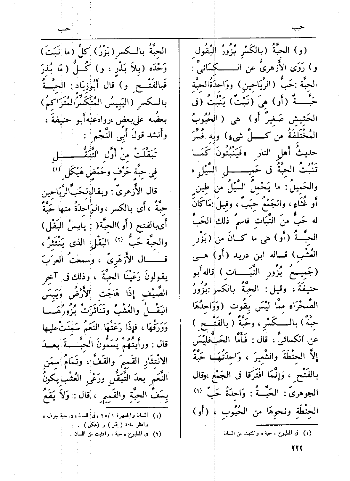 (و) {الحِبَّةُ (بالكَسْرِ بُزُورُ البُقُولِ و) رَوَى الأَزهريّ عَن الكِسَائيِّ: الحِبَّة: حَبُّ (الرَّيَاحِينِ) ووَاحِدَةُ الحِبَّةِ حَبَّةٌ (أَو) هِيَ (نَبْتٌ) يَنْبُتُ (فِي الحَشِيشِ صَغِيرٌ أَو) هِيَ (الحُبُوبُ المُخْتَلِفَةُ من كلِّ شيءٍ) وبِهِ فُسِّرَ حديثُ أَهلِ النارِ (فَيَنْبُتُونَ كَمَا تَنْبُتُ} الحِبَّةُ فِي حَمِيلِ السَّيْلِ) والحَمِيلُ: مَا يَحْمِلُ السَّيْلُ من طِينٍ أَو غُثَاءٍ، والجَمْعُ! حِبَبٌ، وقِيلَ: مَا كَانَ لَهُ حَبٌّ منَ النَّبَاتِ فاسمُ ذَلِك الحَبِّ الحِبَّةُ (أَو) هِيَ مَا كانَ من (بَزْرِ العُشْبِ) قَالَه ابْن دُرَيْد (أَو) هِيَ (جَمِيعُ بُزُورِ النَّبَاتِ) قَالَه أَبو حنيفَةَ، وَقيل: الحبَّةُ بِالْكَسْرِ: بُزُورُ الصَّحْرَاءِ مِمَّا لَيْسَ بِقُوتٍ (وَوَاحِدُهَا حِبَّةٌ: بالكَسْرِ، وحَبَّةٌ (بالفَتْحِ) عَن الكسائيِّ، قَالَ: فَأَمَّا الحَبُّ فليْسَ إِلاَّ الحِنْطَةَ والشَّعِيرَ، وَاحِدَتُهَا حَبَّةٌ بالفَتْحِ، وإِنَّمَا افْتَرَقَا فِي الجَمْع، وَقَالَ الجوهريّ: الحَبَّةُ: وَاحِدَةُ حَبّ الحِنْطَةِ ونحوِهَا من الحُبُوبِ، (أَو) الحِبَّةُ بالكسرِ (بَزْرُ) كلِّ (مَا نَبَتَ) وَحْدَه (بِلاَ بَذْرٍ، و) كُلُّ (مَا بُذِرَ فَبالفَتْحِ و) قَالَ أَبُو زِيَادٍ: الحِبَّةُ بالكسرِ (اليَبِيسُ المُتَكَسِّرُ المُتَرَاكِمُ) بعضُه على بعضٍ، رَوَاهُ عَنهُ أَبو حنيفةَ، وأَنشد قولَ أَبِي النَّجْمِ: