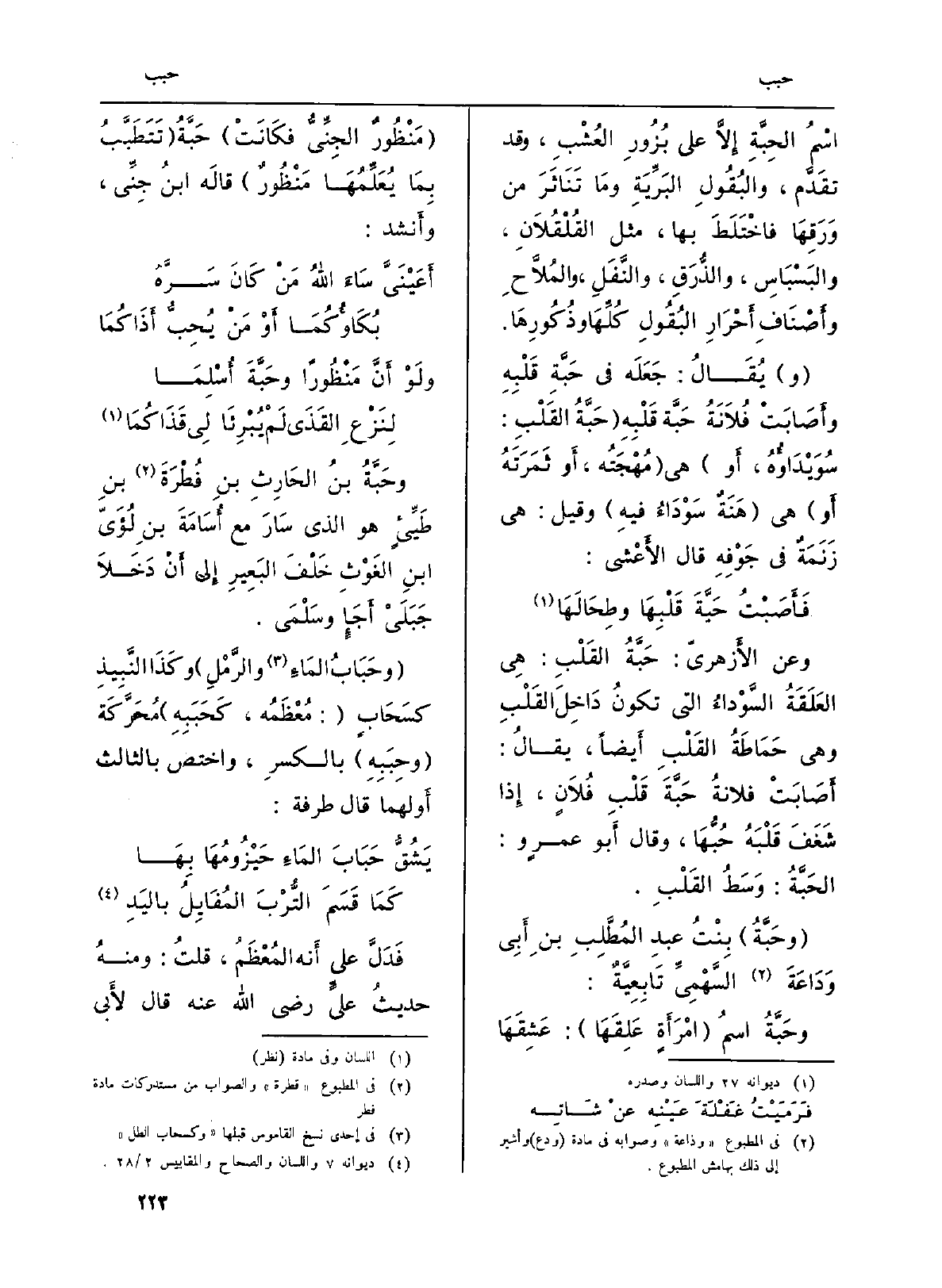 وحَبَّةُ اسمُ (امْرَأَةٍ عَلِقَهَا) : عَشِقَهَا (مَنْظُورٌ الجِنِّيُّ فكَانَتْ) حَبَّةُ (تَتَطَّبَّبُ بِمَا يُعَلِّمُهَا مَنْظُورٌ) قالَه ابنُ جِنِّي، وأَنشد: