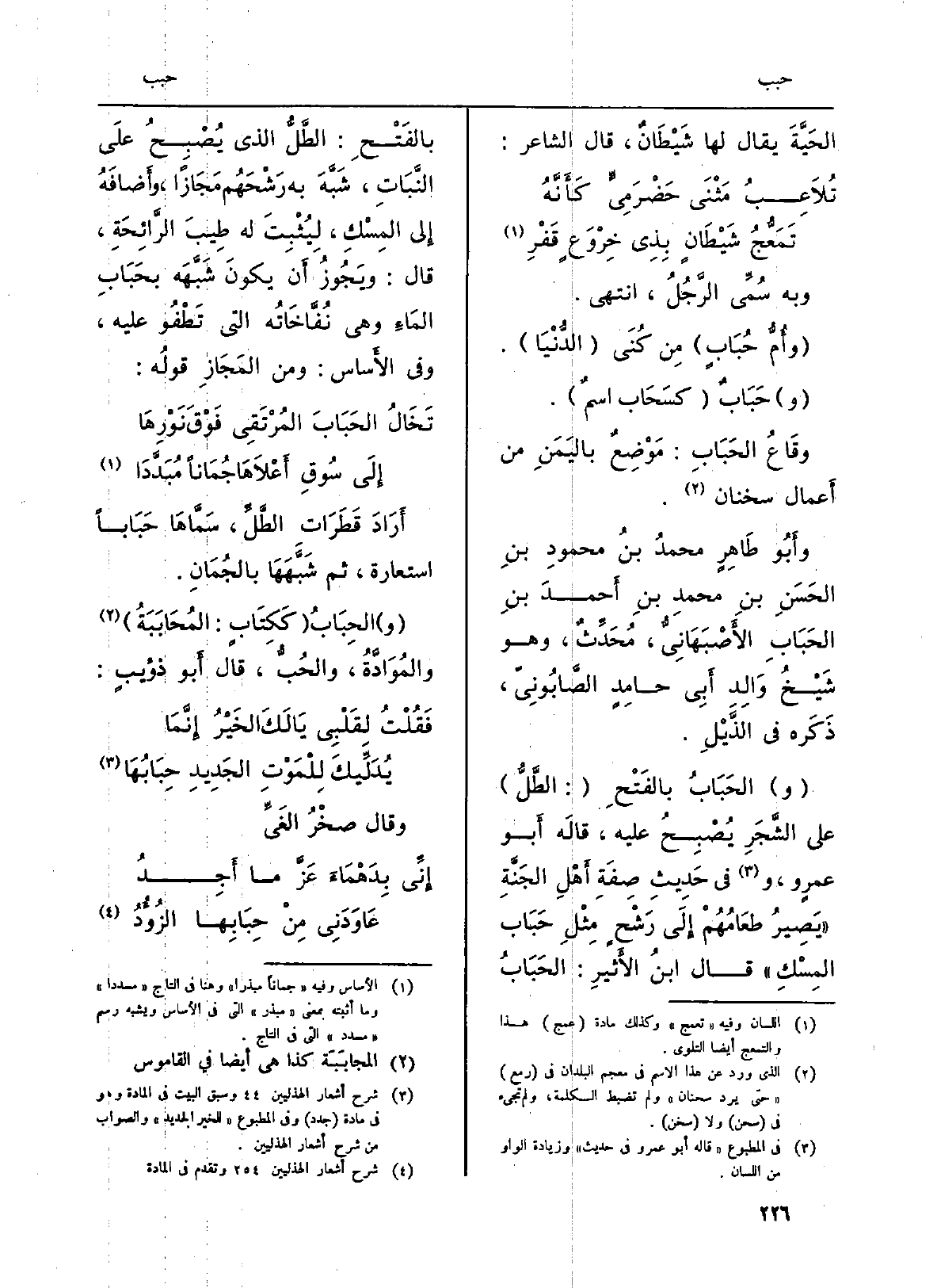 (و) الحَبَابُ بالفَتْحِ (: لطَّلُّ) على الشَّجَرِ يُصْبِحُ عَلَيْهِ، قالَه أَبو عمرٍ و، وَفِي حَدِيثِ صِفَةِ أَهْلِ الجَنَّةِ (يَصِيرُ طعَامُهُمْ إِلَى رَشْحٍ مِثْلِ حَبَاب المِسْكِ) قَالَ ابنُ الأَثيرِ: الحَبَابُ بالفَتْحِ: الطَّلُّ الَّذِي يُصْبِحُ علَى النَّبَاتِ، شَبَّهَ بِهِ رَشْحَهُم مَجَازاً، وأَضافَهُ إِلى المِسْكِ، لِيُثْبِتَ لَهُ طِيبَ الرَّائِحَةِ، قَالَ: ويَجُوزُ أَن يكونَ شَبَّهَه بحَبَابِ المَاءِ وَهِي نُفَّاخَاتُه الَّتِي تَطْفُو عَلَيْهِ، وَفِي الأَساس: وَمن المَجَازِ قولُه:
