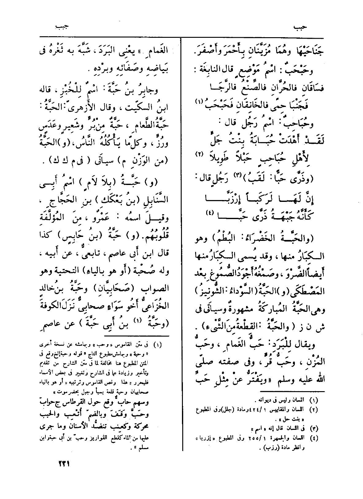 وجابِرُ بنُ حَبَّةَ: اسْمٌ لِلْخُبْزِ: قَالَه ابنُ السَّكّيت، وَقَالَ الأَزهريّ: الحَبَّةُ: حَبَّةُ الطَّعَامِ، حَبَّةٌ مِنْ بُرَ وشَعِيرٍ وعَدَسٍ ورُزَ، وكلّ مَا يَأْكُلُهُ النَّاسُ، (و) الحَبَّةُ (من الوَزْنِ م) سيأَتي (فِي مكك) .