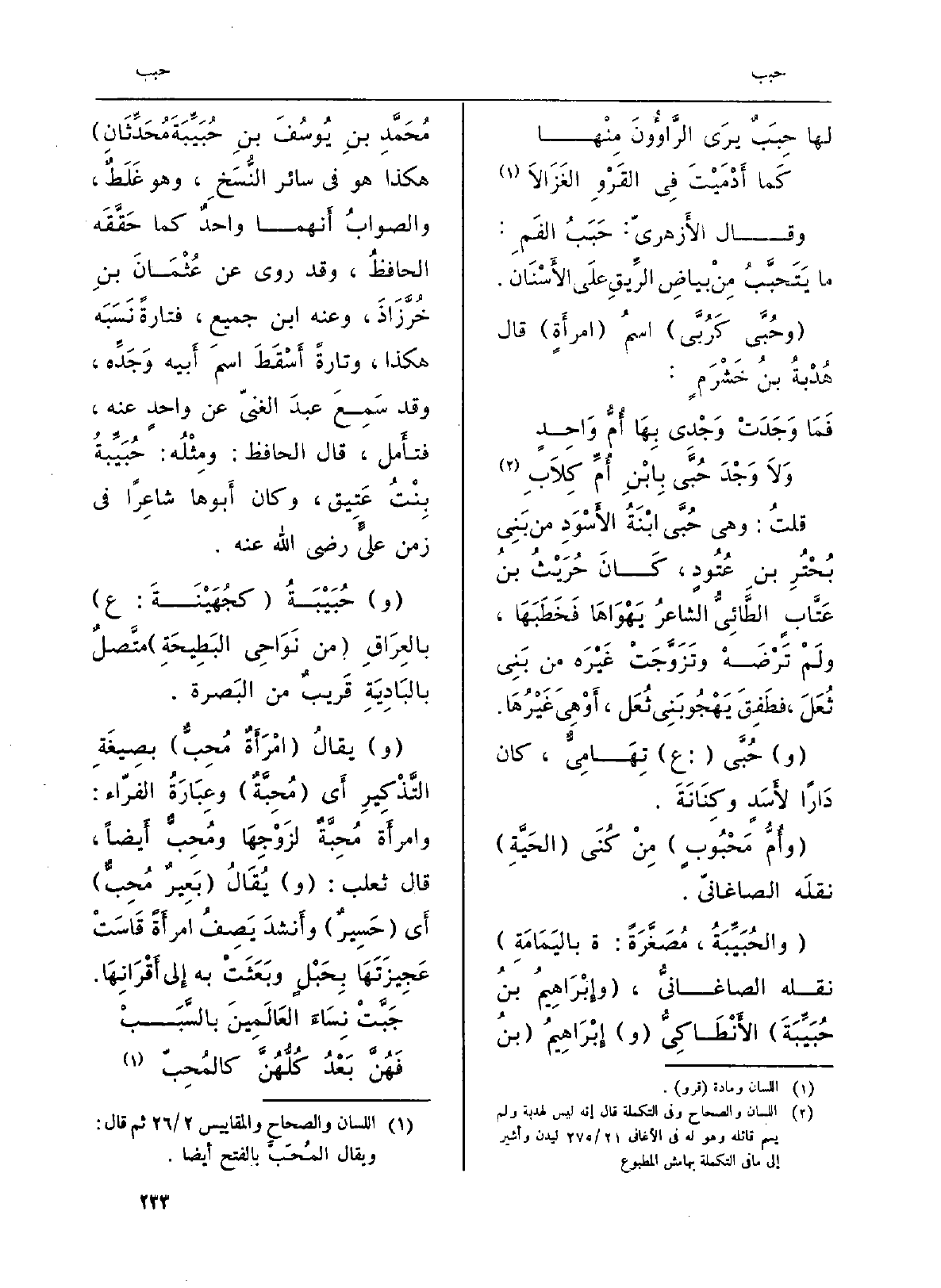 (} والحُبَيِّبَةُ، مُصَغَّرَةً: ة باليَمَامَةِ) نقلة الصاغانيُّ، (وإِبْرَاهِيمُ بنُ {حُبَيِّبَةَ) الأَنْطَاكِيُّ (و) إِبْرَاهِيمُ (بنُ مُحَمَّدِ بنُ يُوسُفَ بنِ حُبَيِّبَةَ مُحَدِّثَانِ) هَكَذَا هُوَ فِي سَائِر النُّسَخِ، وَهُوَ غَلَطٌ، والصوابُ أَنهما واحدٌ كَمَا حَقَّقَه الحافظُ، وَقد روى عَن عُثْمَانَ بنِ خُرَّزَاذَ، وَعنهُ ابْن جَمِيع، فَتَارَة نَسَبَه هَكَذَا، وَتارَة أَسْقَطَ اسمَ أَبيه وجَدِّه، وَقد سَمِعَ عبدَ الغنيّ عَن واحدٍ عَنهُ، فتأَمل، قَالَ الْحَافِظ: ومِثْلُه: حُبَيِّبةُ بِنْتُ عَتِيق، وَكَانَ أَبوها شاعِراً فِي زمن عليَ رَضِي الله عَنهُ.