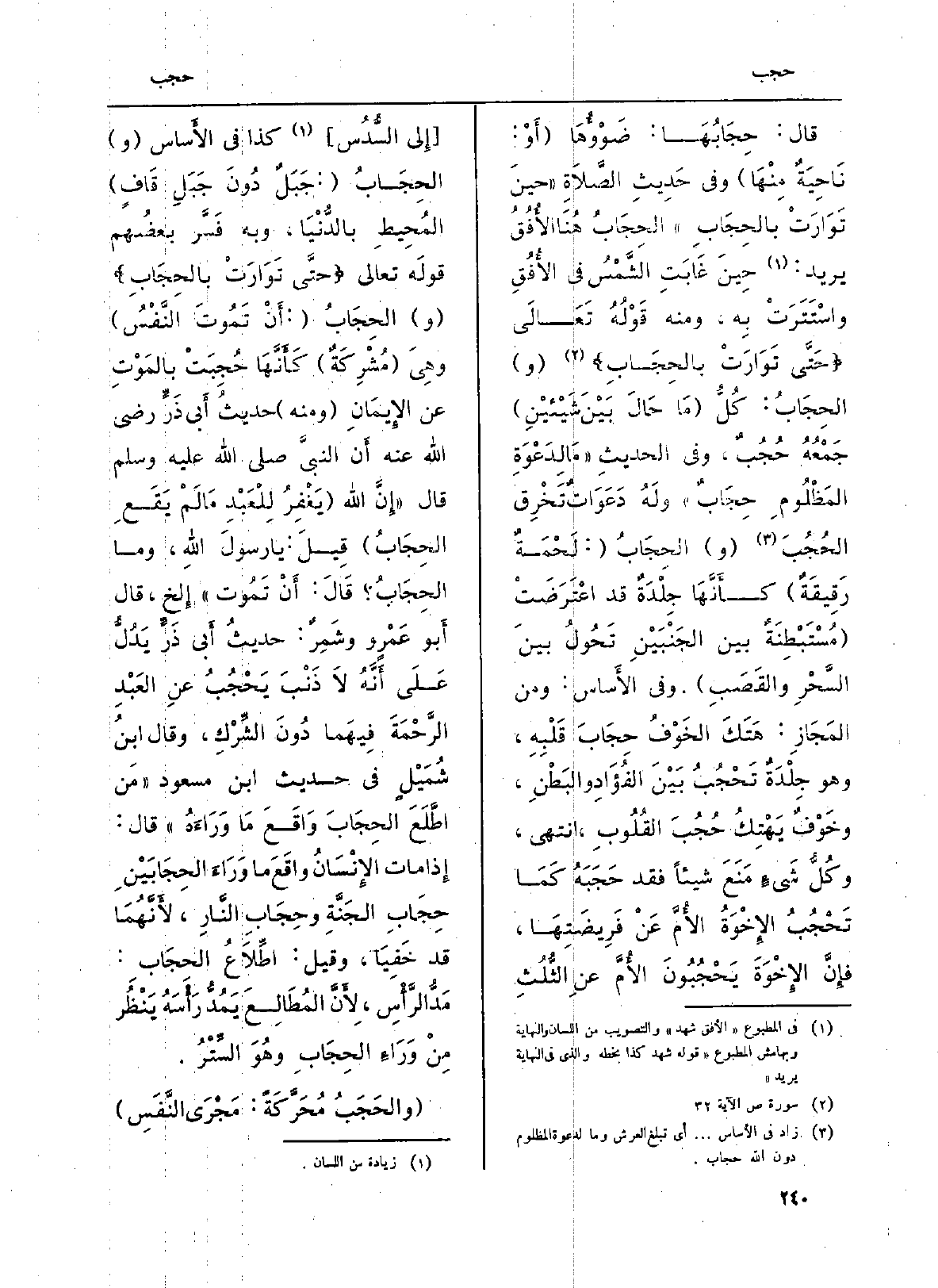 قَالَ: حِجَابُهَا: ضَوْؤُهَا (أَوْ نَاحِيَةٌ مِنْهَا) وَفِي حَدِيثِ الصَّلاَةِ (حينَ تَوَارَتْ بالحِجَابِ) الحِجَابُ هُنَا الأُفُقُ يُرِيد: حِينَ غابَتِ الشَّمْسُ فِي الأُفُقِ واسْتَتَرَتْ بِه، وَمِنْه قَوْلُهُ تَعَالَى {حَتَّى تَوَارَتْ بِالْحِجَابِ} (ص: 32) (و) الحِجَابُ: كُلُّ (مَا حَالَ بَيْنَ شَيْئيْنِ) جمْعُهُ حُجُبٌ، وَفِي الحديثِ (مَا لِدَعْوةِ المَظْلُومِ حِجَابٌ) ولَهُ دَعَوَاتٌ تَخْرِق الحُجُبَ (و) الحِجَابُ (: لَحْمَةٌ رَقِيقَةٌ) كأَنَّهَا جِلْدَةٌ قد اعْتَرَضَتْ (مُسْتَبْطِنَةٌ بَين الجَنْبَيْنِ تَحُولُ بينَ السَّحْرِ والقَصَبِ) . وَفِي الأَساس: وَمن المَجَازِ: هَتَكَ الخَوْفُ حُجَابَ قَلْبِهِ، وَهُوَ جِلْدَةٌ تَحْجُبُ بَيْنَ الفُؤَادِ والبَطْنِ، وخَوْفٌ يَهْتِكُ حُجُبَ القُلُوبِ، انْتهى، وكُلُّ شَيءٍ مَنَعَ شَيْئا فقد حَجَبَهُ كَمَا تَحْجُبُ الإِخْوَةُ الأُمَّ عَنْ فَرِيضَتِهَا، فإِنَّ الإِخْوَةَ يَحْجُبُونَ الأُمَّ عنِ الثُّلُثِ (إِلى السُّدُس) كَذَا فِي الأَساس (و) الحِجَابُ (: جَبَلٌ دُونَ جَبَلِ قَافٍ) المُحِيطِ بالدُّنْيَا، وَبِه فَسَّر بعضُهم قولَه تَعَالَى: {حَتَّى تَوَارَتْ بِالْحِجَابِ} (و) الحِجَابُ (: أَنْ تَمُوتَ النَّفْسُ) وهِيَ (مُشْرِكَةٌ) كأَنَّهَا حُجِبَتْ بالمَوتِ عَن الإِيمَانِ (وَمِنْه) حديثُ أَبي ذَرَ رَضِي الله عَنهُ أَن النبيَّ صلى الله عَلَيْهِ وسلمقال: (إِنَّ الله (يَغْفِرُ لِلْعَبْدِ مَا لَمْ يَقَعِ الحِجَابُ) قِيلَ: يَا رسولَ اللَّهِ، وَمَا الحِجَابُ؟ قَالَ: أَنْ تَمُوت) إِلخ، قَالَ أَبو عَمْرو وشَمِرٌ: حديثُ أَبي ذَرَ يَدُلُّ عَلَى أَنَّهُ لاَ ذَنْبَ يَحْجُبُ عَن العَبْدِ الرَّحْمَةَ فِيهما دُونَ الشِّرْكِ، وَقَالَ ابنُ شُمَيْلٍ فِي حَدِيث ابْن مَسْعُود (مَن اطَّلَعَ الحِجَابَ وَاقَعَ مَا وَرَاءَهُ) قَالَ: إِذا مَاتَ الإِنْسَانُ واقَعَ مَا وَرَاءَ الحِجَابَيْنِ حِجَابِ الجَنَّةِ وحِجَابِ النَّارِ، لأَنَّهُمَا قد خَفِيَا، وَقيل: اطِّلاعُ الحِجَابِ: مَدُّ الرَّأْسِ، لاِءَنَّ المُطَالِعَ يَمُدُّ رَأْسَهُ يَنْظُر مِنْ وَرَاءِ الحِجَابِ وهُوَ السِّتْرُ.