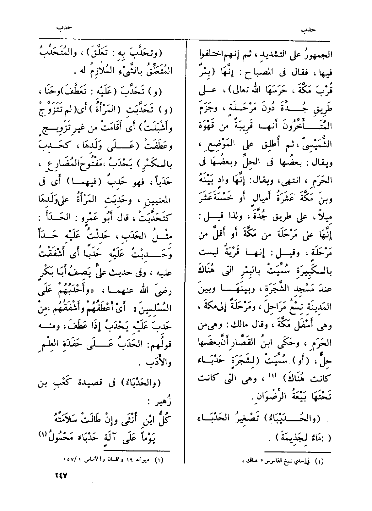 الجمهورُ على التشديدِ، ثمَّ إِنهم اخْتلفُوا فِيهَا، فَقَالَ فِي (الْمِصْبَاح) إِنَّهَا (بِئرٌ قُرْبَ مَكَّةَ، حَرَسَهَا الله تَعَالَى) ، على طَرِيقِ جُدَّةَ دُونَ مَرْحَلَةٍ، وجمَ المُتَأَخِّرُونَ أَنها قَرِيبَةٌ من قَهْوَة الشُّمَيْسِيّ، ثمَّ أُطلِق على المَوْضِعِ، وَيُقَال: بعضُها فِي الحِلِّ وبعضُهَا فِي الحَرَمِ، انْتهى، وَيُقَال: إِنَّهَا وادٍ بَيْنَهُ وبنَ مَكَّةَ عَشَرَةُ أَميالٍ أَو خَمْسَةَ عَشَرَ مِيلاً، على طَرِيق جُدَّةَ، وَلذَا قيل: إِنَّهَا على مَرْحَلَة من مَكَّةَ أَو أَقلَّ من مَرْحَلَةٍ، وَقيل: إِنها قَرْيَةٌ لَيست بالكَبِيرَةِ سُمِّيَتْ بالبِئرِ الَّتِي هُنَاكَ عندَ مَسْجِدِ الشَّجَرَةِ، وبينَهَا وبينَ المَدِينَةِ تِسْعُ مَرَاحِلَ، ومَرْحَلَةٌ إِلى مكةَ، وَهِي أَسْفَل مَكَّةَ، وَقَالَ مَالك: وَهِي من الحَرَمِ، وحَكَى ابنُ القَصَّارِ أَنَّ بعضَها حلٌّ، (أَو) سُمِّيَتْ (لِشَجَرَةٍ حَدْبَاءَ كَانَت هُنَاكَ) ، وَهِي الَّتِي كَانَت تَحْتَهَابَيْعَةُ الرِّضْوَانِ.