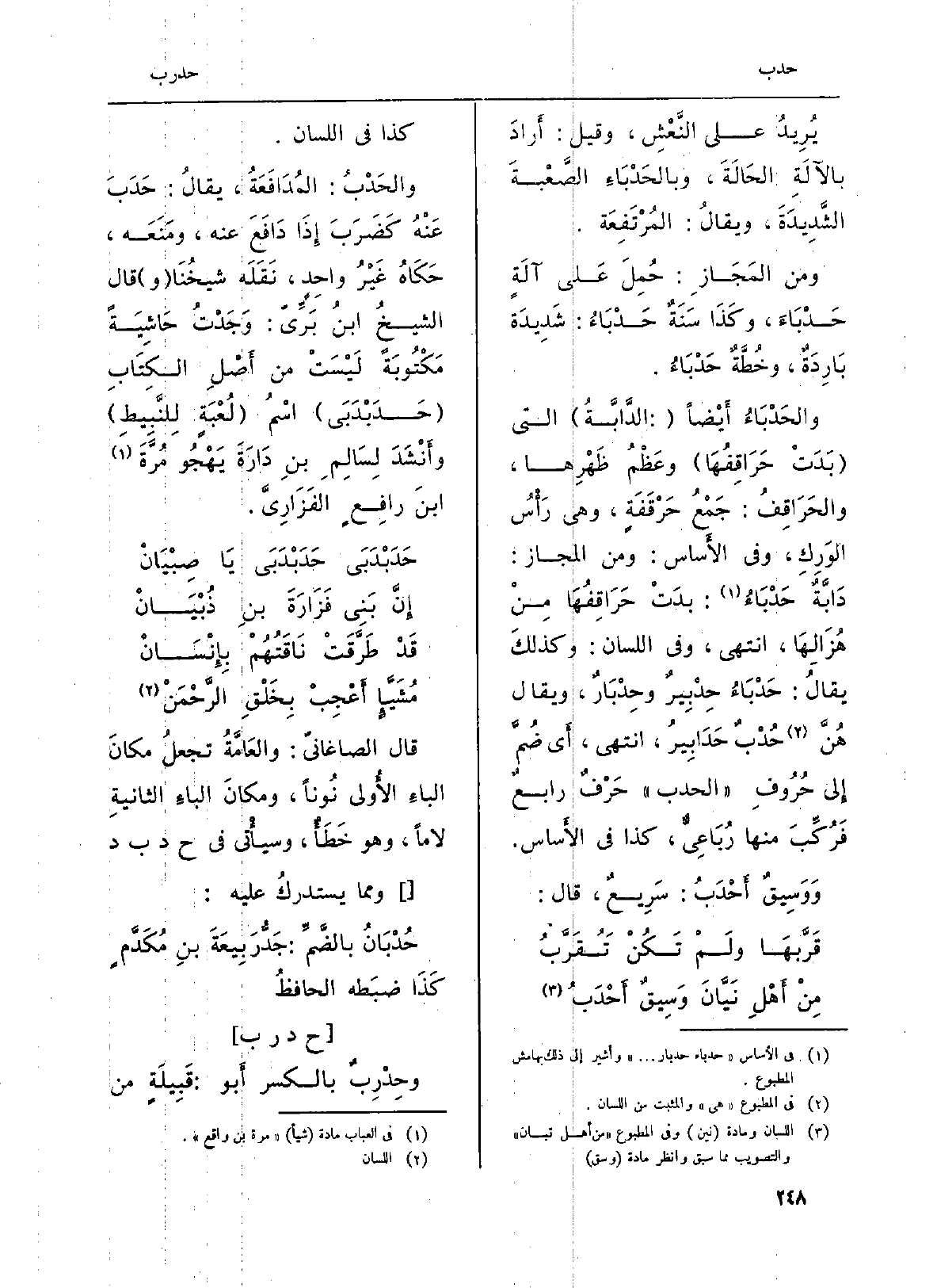 والحَدْبُ: المُدَافَعَةُ، يقالُ حَدَبَ عَنْهُ كَضَرَبَ إِذَا دَافَعَ عَنهُ، ومَنَعَه، حَكَاهُ غَيْرُ واحِدٍ، نَقَلَه شيخُنَا (و) قَالَ الشيخُ ابنُ بَرِّيّ: وَجَدْتُ حَاشِيَةً مَكْتُوبَةً لَيْسَتْ من أَصْلِ الكِتَابِ (حَدَبْدَبَى) اسْمُ (لُعْبَةٍ لِلنَّبِيطِ) وأَنْشَدَ لِسَالِمِ بنِ دَارَةَ يَهْجُو مُرَّةَ ابنَ رافِعٍ الفَزَارِيَّ.