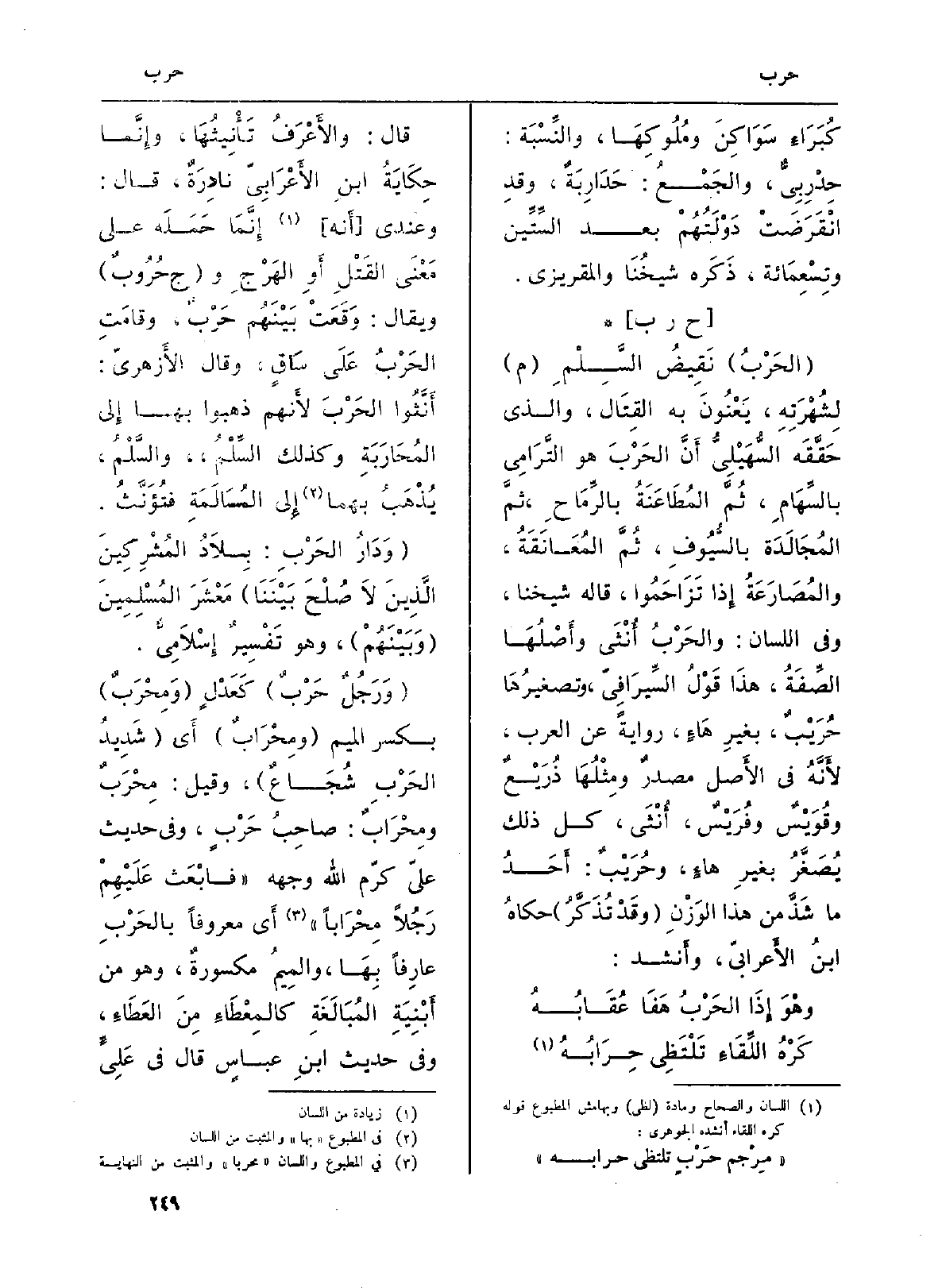 : (الحَرْبُ) نَقِيضُ السَِّلْمُ (م) لِشُهْرَتِهِ، يَعْنُونَ بِهِ القِتَال، وَالَّذِي حَقَّقَه السُّهَيْلِيُّ أَنَّ الحَرْبَ هُوَ التَّرَامِي بالسِّهَامِ، ثُمَّ المُطَاعَنَةُ بالرِّمَاحِ، ثمَّ المُجَالَدَة بالسُّيُوفِ، ثِمَّ المُعَانَقَةُ، والمُصَارَعَةُ إِذا تَزَاحَمُوا، قَالَه شَيخنَا، وَفِي (اللِّسَان) : والحَرْبُ أُنْثَى وأَصْلُهَا الصِّفَةُ، هذَا قَوْلُ السِّيرَافِيّ، وتصغيرُهَا حُرَيْبٌ، بغيرِ هَاءٍ، رِوَايَة عَن الْعَرَب لأَنَّهُ فِي الأَصل مصدرٌ ومِثْلُهَا ذُرَيْعٌ وقِوَيْسٌ وفِرَيْسٌ، أُنْثَى، كل ذَلِك يُصَغَّرُ بغيرِ هاءٍ، وحُرَيْبٌ: أَحَدُ مَا شَذَّ من هَذَا الوَزْنِ (وقَدْ تُذَكَّرُ) حكاهُ ابنُ الأَعرابيّ، وأَنشد:
