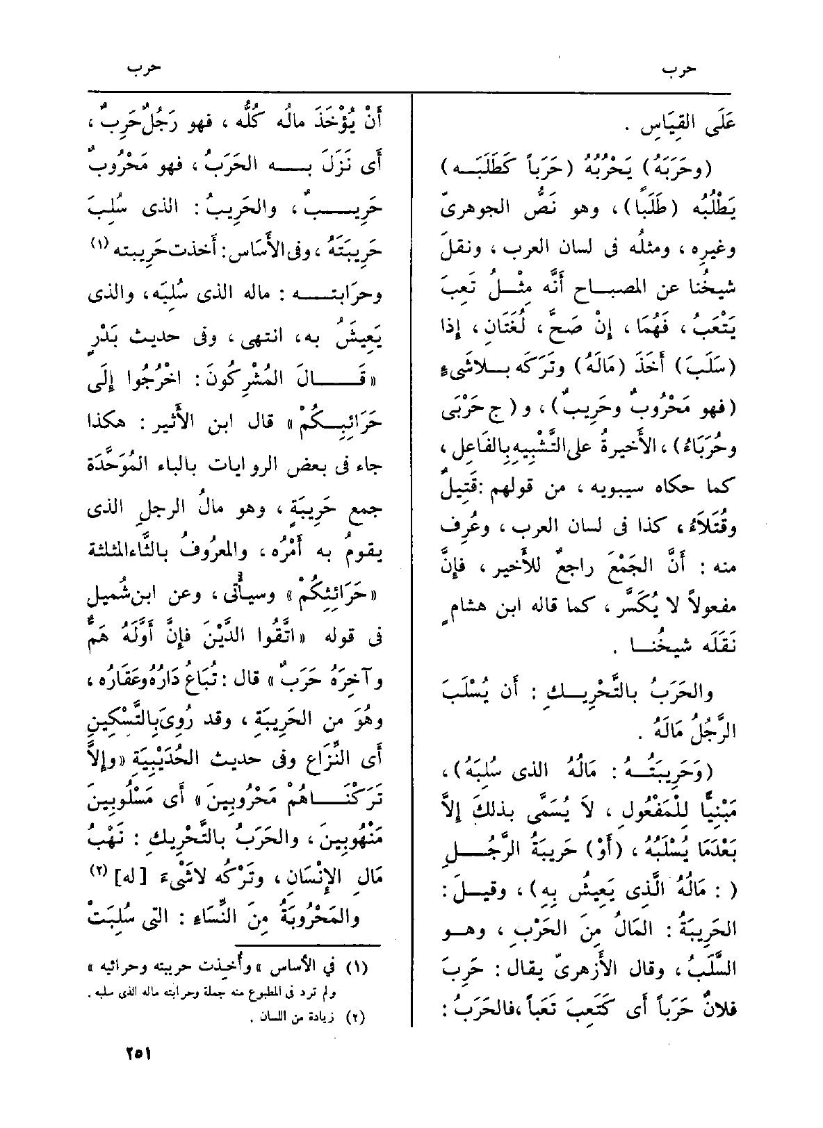 (وَحَرِيبَتُهُ: مَالُهُ الَّذِي سُلِبَهُ) ، مَبْنِيًّا لِلْمَفْعُولِ، لاَ يُسَمَّى بذلكَ إِلاَّ بَعْدَمَا يُسْلَبُهُ، (أَو) حَريبَةُ الرَّجُلِ (: مَالُهُ الَّذِي يَعِيشُ بِهِ) ، وقيلَ: الحَرِيبَةُ: المَالُ مِنَ الحَرْبِ، وَهُوَ السَّلَبُ، وَقَالَ الأَزهريّ يُقَال: حَرِبَ فلانٌ حَرَباً أَي كَتَعِبَ تَعَباً، فالحَرَبُ: أَنْ يُؤْخَذَ مالُه كُلُّه، فَهُوَ رَجُلٌ حَرِبٌ، أَي نَزَلَ بِهِ الحَرَبُ، فَهُوَ مَحْرُوبٌ حَرِيبٌ، والحَرِيبُ: الَّذِي سُلِبَ حَرِيبَتَهُ، وَفِي الأَسَاس: أَخذت حَرِيبته وحرَابته: مَاله الَّذِي سُلِبَه، وَالَّذِي يَعِيشُ بِهِ، انْتهى، وَفِي حَدِيث بَدْرٍ (قَالَ المُشْرِكُونَ: اخْرُجُوا إِلَى حَرَائِبِكُمْ) قَالَ ابْن الأَثير: هَكَذَا جَاءَ فِي بعض الرِّوَايَات بِالْبَاء المُوَحَّدَة جمع حَرِيبَةٍ، وَهُوَ مالُ الرجلِ الَّذِي يقومُ بِهِ أَمْرُه، والمعرُوفُ بالثَّاء الْمُثَلَّثَة (حَرَائِثِكُمْ) وسيأْتي، وَعَن ابْن شُميل فِي قَوْله: (اتصقُوا الدَّيْنَ فإِنَّ أَوَّلَهُ هَمٌّ وآخِرَهُ حَرَبٌ) قَالَ: تُبَاعُ دَارُهُ وعَقَارُه، وهُوَ من الحَرِيبَةِ، وَقد رُوِيَ بِالتَّسْكِينِ أَي النِّزَاع وَفِي حَدِيث الحُدَيْبِيَةِ (وإِلاَّ تَرَكْنَاهُمْ مَحْرُوبِينَ) أَي مَسْلُوبِينَ مَنْهُوبِينَ، والحَرَبُ بالتَّحْرِيكِ: نَهْبُ مَالِ الإِنْسَانِ، وتَرْكُه لَا شَيْءَ (لَهُ) .