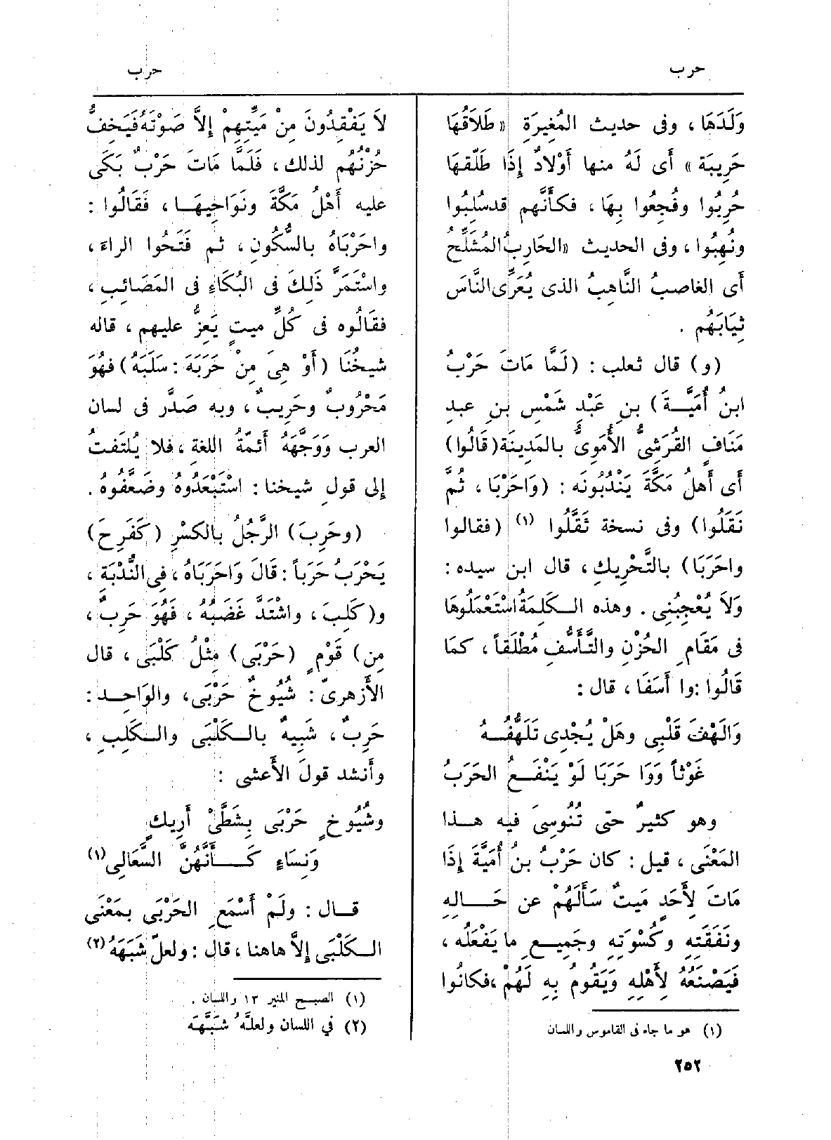 وَهُوَ كثيرٌ حَتَّى تُنُوسِيَ فِيهِ هَذَا المَعْنَى، قيل: كَانَ حَرْبُ بنُ أُمَيَّةَ إِذَا مَاتَ لاِءَحَدٍ مَيتٌ سَأَلَهُمْ عَن حَالِهِ ونَفَقَتِهِ وكُسْوَتِهِ وجَمِيعِ مَا يَفْعَلُه، فَيَصْنَعُهُ لاِءَهْلِهِ وَيَقُومُ بِهِ لَهُمْ، فكانُوا لاَ يَفْقِدُونَ مِنْ مَيِّتِهِمْ إِلاَّ صَوْتَهُ فَيَخِفُّ حُزْنُهُم لذَلِك، فَلَمَّا مَاتَ حَرْبٌ بَكَى عَلَيْهِ أَهْلُ مَكَّةَ ونَوَاحِيهَا، فَقَالُوا: واحَرْبَاهُ بالسُّكُونِ، ثمَّ فَتَحُوا الراءَ، واسْتَمَرَّ ذَلِكَ فِي البُكَاءِ فِي المَصَائِبِ، فقَالُوه فِي كُلِّ ميتٍ يَعِزُّ عَلَيْهِم، قَالَه شيخُنَا (أَوْ هِيَ مِنْ حَرَبَهَ: سَلَبَهُ) فهُوَ مَحُرُوبٌ وحَرِيبٌ، وَبِه صَدَّر فِي (لِسَان الْعَرَب) وَوَجَّهَهُ أَئمّةُ اللغةِ، فَلَا يُلتَفتُ إِلى قولِ شَيخنَا: اسْتَبْعَدُوهُ وضَعَّفُوهُ.