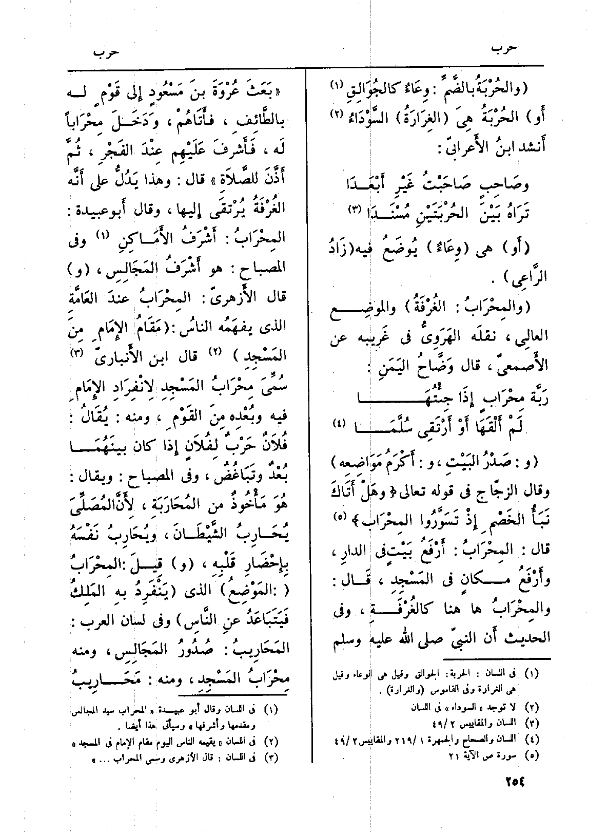 (و: صَدْرُ البَيْتِ، و: صَدْرُ البَيْتِ، و: أَكْرَمُ مَوَاضِعِه) وَقَالَ الزجّاج فِي قَوْله تَعَالَى: {2. 018 وَهل اءَتاك. . الْمِحْرَاب} (ص: 21) قَالَ: المِحْرَابُ: أَرْفَعُ بَيْتٍ فِي الدارِ، وأَرْفَعُ مكانٍ فِي المَسْجِدِ، قَالَ: والمِحْرَابُ هَا هُنَا كالغُرْفَةِ، وَفِي الحَدِيث أَن النبيّ صلى الله عَلَيْهِ وَسلم (بَعَثَ عُرْوَةَ بنَ مَسْعُودٍ إِلى قَوْمٍ لَهُ بالطَّائِفِ، فأَتَاهُمْ، وَدَخَلَ مِحْرَاباً لَه، فَأَشرفَ عَلَيْهِم عِنْدَ الفَجْرِ، ثُمَّ أَذَّنَ للصَّلاَةِ) قَالَ: وَهَذَا يَدُلُّ على أَنَّه الغُرْفَةُ يُرْتقَى إِليها، وَقَالَ أَبو عُبَيْدَة: المَحْرَابُ: أَشْرَفُ الأَمَاكِنِ وَفِي (الْمِصْبَاح) : هُوَ أَشْرَفُ المَجَالِسِ، (و) قَالَ الأَزهريّ: المِحْرَابُ عندَ العَامَّةِ الَّذِي يفهَمُه الناسُ: (مَقَامُ الإِمَامِ مِنَ المَسْجِدِ) قَالَ ابْن الأَنباريّ سُمِّيَ مِحْرَابُ المَسْجِدِ لاِنْفِرَادِ الإِمَامِ فِيهِ وبُعْدِه مِنَ القَوْمِ، وَمِنْه: يُقَالُ: فُلاَنٌ حَرْبٌ لِفُلاَنٍ إِذا كَانَ بينَهُمَا بُعْدٌ وتَبَاغُضٌ، وَفِي (الْمِصْبَاح) : وَيُقَال: هُوَ مَأْخُوذٌ من المُحَارَبَةِ، لاِءَنَّ المُصَلِّيَ يُحَارِبُ الشَّيْطَانَ، ويُحَارِبُ نَفْسَهُ بِأَحْضَارِ قَلْبِهِ، (و) قِيلَ: المِحْرَابُ (: المَوْضِعُ) الَّذِي (يَنْفَرِدُ بهِ المَلِكُ فَيَتَبَاعِدُ عنِ النَّاسِ وَفِي (لِسَان الْعَرَب) : المَحَارِيبُ: صُدُورُ المَجَالِسِ، وَمِنْه مِحْرَابُ المَسْجِدِ، وَمِنْه: مَحَارِيبُ