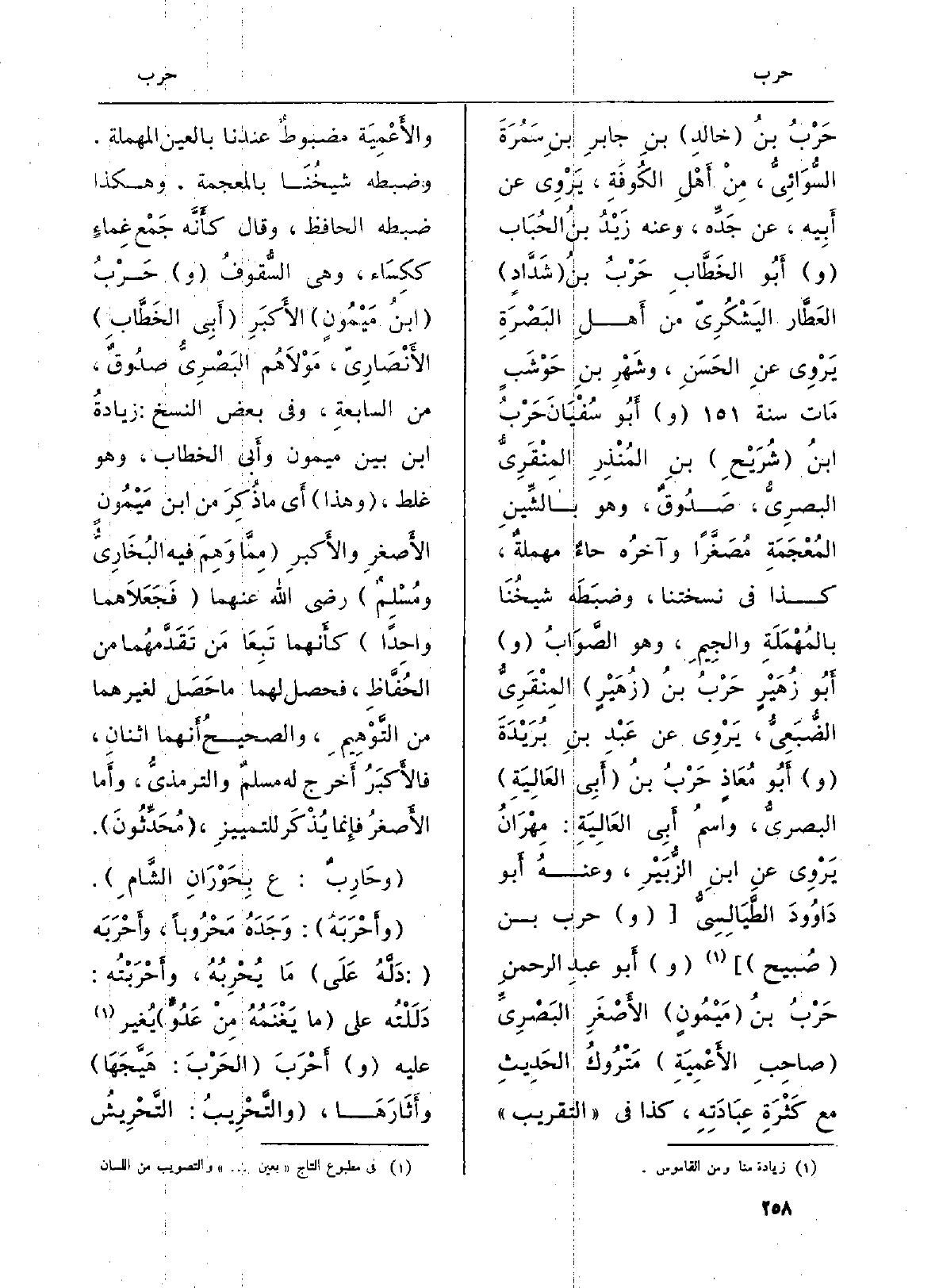 حَرْبُ بنُ (خالدِ) بنِ جابرِ بنِ سَمُرَةَ السُّوَائِيُّ، مِنْ أَهْلِ الكُوفَةِ، يَرْوِي عَن أَبِيه، عَن جَدِّه، وَعنهُ زَيْدُ بنُ الحُبَاب (و) أَبُو الخَطَّابِ حَرْبُ بنُ (شَدَّادٍ) العَطَّار اليَشْكُرِيّ من أَهلِ البَصْرَةِ يَرْوِي عنِ الحَسَنِ، وشَهْرِ بنِ حَوْشَبٍ مَات سنة 15 (و) أَبُو سُفْيَانَ حَرْبُ بنُ (شُرَيْحِ) بنِ المُنْذِرِ المِنْقَرِيُّ البصرِيُّ، صَدُوقٌ، وَهُوَ بالشِّينِ المُعْجَمَةِ مُصَغَّراً وآخرُه حاءٌ مهملةٌ، كَذَا فِي نسختنا، وضبَطَه شيخُنا بالمُهْمَلَةِ والجِيمِ، وَهُوَ الصَّوَابُ (و) أَبُو زُهَيْرٍ حَرْبُ بنُ (زُهَيْرٍ) المِنْقَرِيُّ الضُّبَعِيُّ، يَرْوِي عَن عَبْدِ بن مُريدَةَ (و) أَبُو مُعَاذٍ حَرْبُ بنُ (أَبِي العالِيَةِ) البصريُّ، واسمُ أَبِي العَالِيَةِ: مِهْرَانُ يَرْوِي عنِ ابنِ الزُّبَيْرِ، وعنهُ أَبو دَاوُودَ الطَّيَالِسِيُّ ((و) حَرْب بن (صُبيح)) (و) أَبو عبدِ الرحمنِ حَرْبُ بنُ (مَيْمُونٍ) الأَصْغَرِ البَصْرِيِّ (صاحِبِ الأَعْمِيَةِ) مَتْرُوكُ الحَدِيثِ مَعَ كَثْرَةِ عِبَادَتاِهِ، كَذَا فِي (التَّقْرِيب) والأَعْمِيَة مضبوطٌ عندنَا بِالْعينِ الْمُهْملَة، وَضَبطه شيخُنَا بِالْمُعْجَمَةِ، وَهَكَذَا ضَبطه الْحَافِظ، وَقَالَ كأَنَّه جَمْع غِماءٍ ككِسَاء، وَهِي السُّقُوفُ (و) حَرْبُ (ابنُ مَيْمُونٍ) الأَكبَرِ (أَبِي الخَطَّابِ) الأَنْصَارِيّ، مَوْلاهُمْ البَصْرِيُّ صَدُوقٌ، من السابعةِ، وَفِي بعض النّسخ: زيادةُ ابْن بَين مَيْمُون وأَبي الْخطاب، وَهُوَ غلط، (وَهَذَا) أَي مَا ذُكِرَ من ابْن مَيْمُونٍ الأَصغرِ والأَكبرِ (مِمَّا وَهِمَ فِيهِ البُخَارِيُّ ومُسْلِمٌ) رَضِي الله عَنْهُمَا (فَجَعَلاَهُما واحِداً) كأَنهما تَبِعَا مَن تَقَدَّمهُمَا من الحُفَّاظِ، فَحصل لَهما مَا حَصَلَ لغَيْرِهِمَا من التَّوْهِيمِ، والصحيحُ أَنِما اثنانِ، فالأَكبَرُ أَخرج لَهُ مسلمٌ والترمذيُّ، وأَما الأَصغرُ فإِنما يُذْكَر للتمييز، (مُحَدِّثُونَ) .