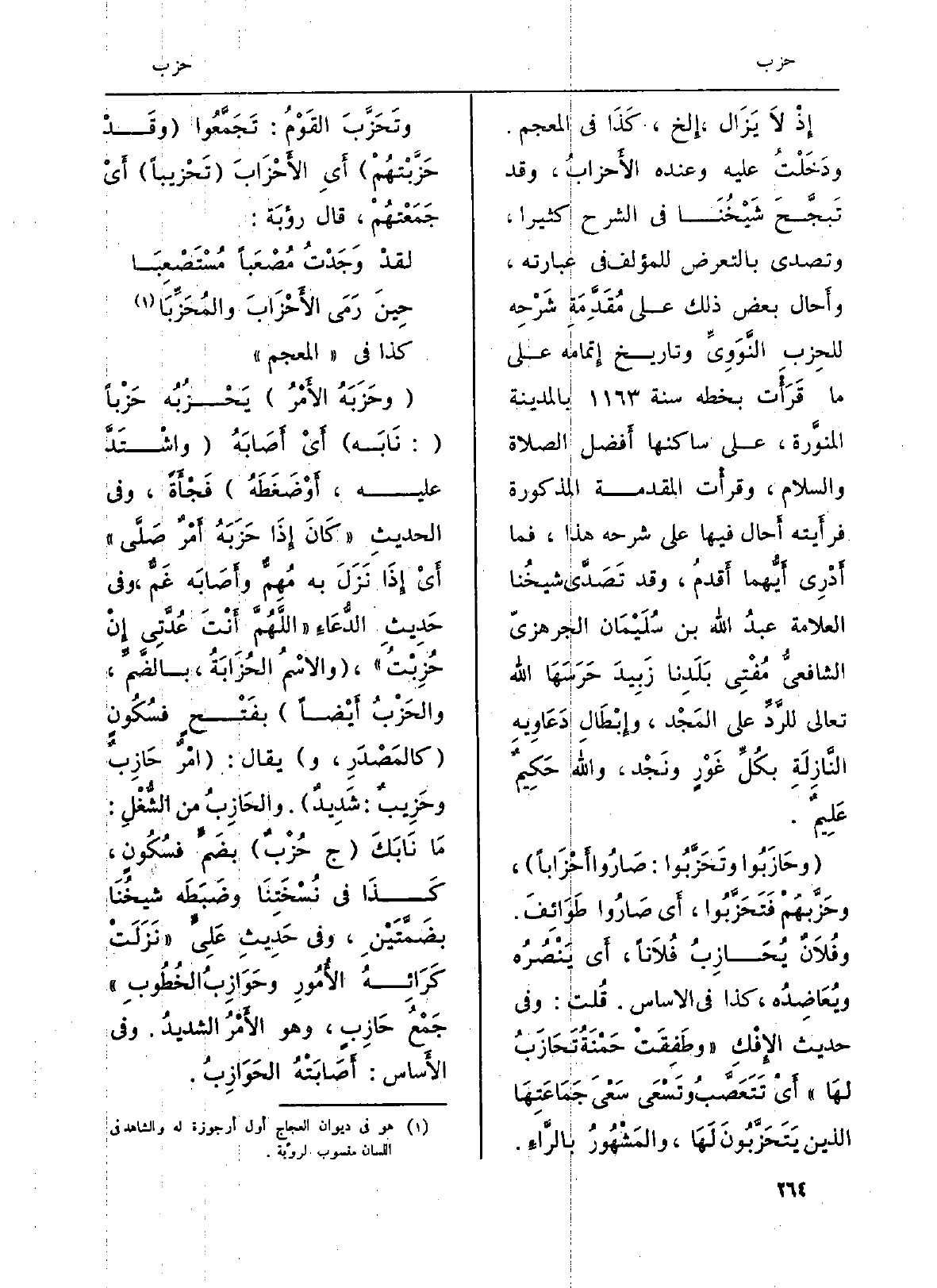 إِذْ لاَ يَزَال، إِلخ، كَذَا فِي (المعجم) . ودَخَلْتُ عَلَيْهِ وَعِنْده الأَحزابُ، وَقد تَبجَّحَ شَيْخُنَا فِي الشَّرْح كثيرا، وتصدى بالتعرض للمؤلف فِي عِبَارَته، وأَحال بعض ذَلِك على مُقَدَّمَةِ شَرْحِه للحِزب النَّوَوِيِّ وتاريخ إِتمامه على مَا قَرَأْت بِخَطِّهِ سنة 1163 بِالْمَدِينَةِ المنوَّرة، على ساكنها أَفضل الصَّلَاة وَالسَّلَام، وقرأْت الْمُقدمَة الْمَذْكُورَة فرأَيته أَحال فِيهَا على شَرحه هَذَا، فَمَا أَدْرِي أَيهما أَقدمُ، وَقد تَصَدَّى شيخُنا الْعَلامَة عبدُ الله بن سُلَيْمَان الجرهزيّ الشافعيّ مُفْتِي بَلَدِنا زَبِيدَ حَرَسَهَا الله تَعَالَى للرَّدِّ على المَجْد، وإِبْطَالِ دَعَاوِيهِ النَّازِلَةِ بكُلِّ غَوْرٍ ونَجْد، وَالله حَكِيمٌ عَلِيمٌ.