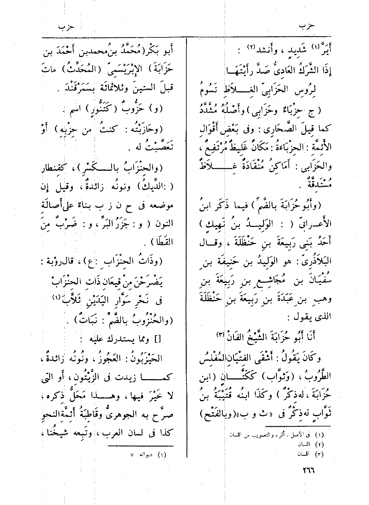وكانَ يَقُولُ: أَشْقَى الفِتْيَانِ المُفْلِسُ الطَّرُوبُ، (وَثوَّاب) كَكَتَّانٍ (ابْن حُزَابَةَ، لَهُ ذِكْرٌ) وكَذَا ابنُه قُتَيْبَةُ بنُ ثَوَّابٍ لَهُ ذِكْرٌ فِي (ثوب) (وبالفَتْح) أَبو بَكْر (مُحَمَّدُ بنُ مُحَمَّد بن أَحْمَدَ بن حَزَابَةَ) الإِبْرَيْسَمِيّ (المُحَدِّثُ) ماتَ قبلَ الستينَ وثلاثمائَة بسَمَرْقَنْدَ.