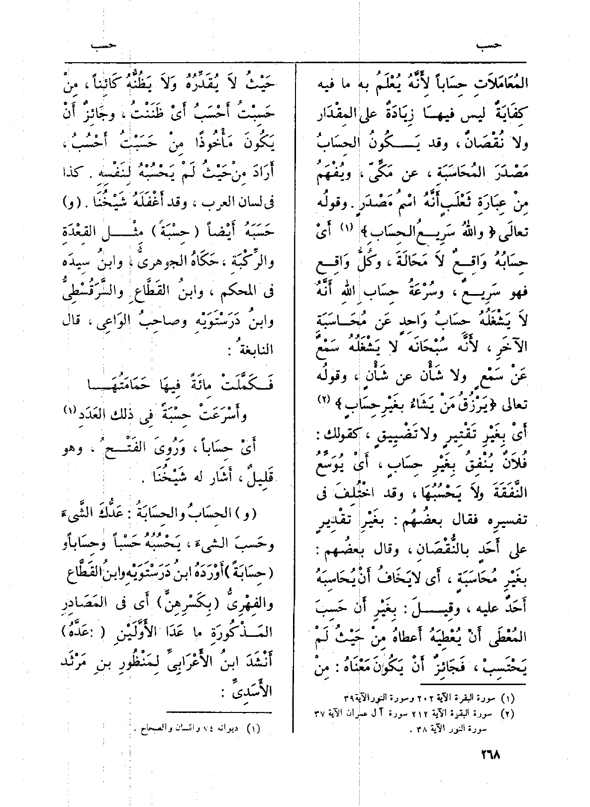 المُعَامَلاَتِ حِسَاباً لاِءَنَّهُ يُعْلَمُ بِهِ مَا فِيهِ كِفَايَةٌ لَيْسَ فيهَا زِيَادَةٌ على المِقْدَار وَلَا نُقْصَانٌ، وَقد يَكُونُ الحِسَابُ مَصْدَرَ المُحَاسَبَةِ، عَن مَكِّيّ، ويُفْهَمُ مِنْ عِبَارَةِ ثَعْلَبٍ أَنَّهُ اسْمُ مَصْدَرٍ. وقولُه تعالَى: {وَاللَّهُ سَرِيعُ الْحِسَابِ} (الْبَقَرَة: 202) أَي حِسَابُهُ وَاقِعٌ لاَ مَحَالَةَ، وكُلُّ وَاقِع فَهُوَ سَرِيعٌ، وسُرْعَةُ حِسَابِ اللَّهِ أَنَّهُ لاَ يَشْغَلُهُ حِسَابُ وَاحِدٍ عَن مُحَاسَبَةِ الآخَرِ، لأَنَّه سُبْحَانَهُ لاَ يَشْغَلُهُ سَمْعٌ عَنْ سَمْعٍ وَلَا شَأْن عَن شَأْنٍ، وقولُه تَعَالَى: {يَرْزُقُ مَن يَشَآء بِغَيْرِ حِسَابٍ} (الْبَقَرَة: 212) أَي بِغَيْرِ تَقْتِيرٍ وَلَا تَضْيِيقٍ، كَقَوْلِك: فُلاَنٌ يُنْفِقُ بِغَيْرِ حِسَابٍ، أَيْ يُوَسَّعُ النَّفَقَةَ ولاَ يَحْسُبُهَا، وَقد اخْتُلِفَ فِي تفسيرِه فَقَالَ بعضُهُم: بغَيُرِ تقْدِيرٍ على أَحَدٍ بالنُّقْصَانِ، وَقَالَ بعضُهم: بغَيْرِ مُحَاسَبَةٍ، أَي لاَ يَخَافُ أَنْ يُحَاسِبَهُ أَحَدٌ عَلَيْهِ، وقِيلَ: بِغَيْرِ أَن حَسِبَ المُعْطَى أَنْ يُعْطِيَهُ أَعطاهُ مِنْ حَيْثُ لَمْ يَحْتَسِبْ، فَجَائِزٌ أَنْ يَكُونَ مَعْنَاهُ: مِنْ حَيْثُ لاَ يُقَدِّرُهُ وَلاَ يَظُنُّهُ كَائِناً، مِن حَسِبْتُ أَحْسَبُ أَيْ ظَنَنْتُ، وجَائِزٌ أَنْ يَكُونَ مَأْخُوذاً مِنْ حَسَبْتُ أَحْسُبُ، أَرَادَ مِنْ حَيْثُ لَمْ يَحْسُبْهُ لِنَفْسِهِ. كَذَا فِي (لِسَان الْعَرَب) ، وَقد أَغْفَلَهُ شَيْخُنَا. (و) حَسَبَهُ أَيْضاً (حِسْبَةً) مِثْل القِعْدَةِ والرِّكْبَةِ، حَكَاهُ الجوهريُّ، وابنُ سِيدَه فِي (الْمُحكم) ، وابنُ القَطَّاعِ والسَّرَقُسْطِيُّ وابنُ دَرَسْتَوَيْهِ وصاحِبُ الوَاعِي، قَالَ النابغةُ: