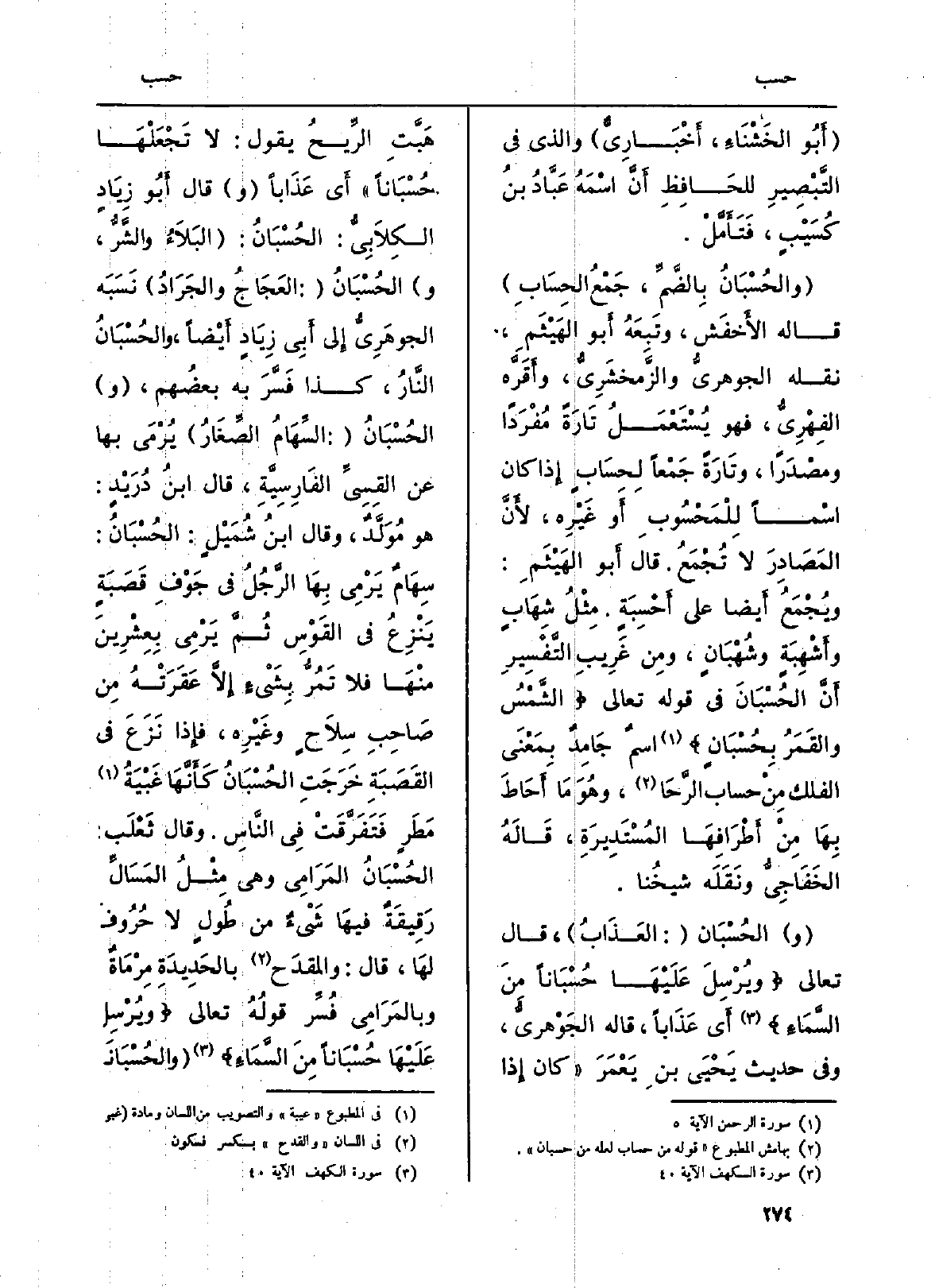 (والحُسْبَانُ بِالضَّمِّ، جَمْعُ الحِسَابِ) قَالَه الأَخفَشِ، وتَبِعَهُ أَبو الهَيْثَمِ، نَقله الجوهريُّ والزَّمخشَرِيّ، وأَقَرَّه الفِهْرِيُّ، فَهُوَ يُسْتَعْمَلُ تَارَةً مُفْرَداً ومصْدَراً، وتَارَةً جَمْعاً لِحِسَابٍ إِذا كَانَ اسْماً لِلْمَحْسُوبِ أَو غَيْرِه، لأَنَّ المَصَادِرَ لَا تُجْمَعُ. قَالَ أَبو الهَيْثَمِ: ويُجْمَعُ أَيضاً على أَحْسِبَةٍ. مِثْلُ شِهَابٍ وأَشْهِبَةٍ وشُهْبَانٍ، ومِن غَرِيبِ التَّفْسِيرِ أَنَّ الحُسْبَانَ فِي قَوْله تَعَالَى: {2. 020 وَالشَّمْس وَالْقَمَر بحسبان} (الرَّحْمَن: 5) اسمٌ جَامِدٌ بِمَعْنَى الفلكِ مِنْ حِسَاب الرَّحَا، وهُوَ مَا أَحَاطَ بِهَا مِنْ أَطْرَافِهَا المُسْتَدِيرَةِ، قَالَهُ الخَفَاجِيُّ ونَقَلَه شيخُنا.